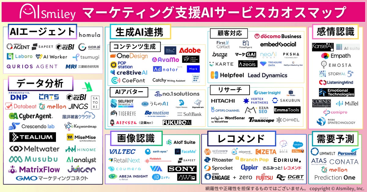 近年では、マルチモーダルな感情認識や、AIエージェントを活用した業務支援も一般化しつつあります。マーケティング支援AIサービスカオスマップは、これら急速に進化するAIソリューションを7カテゴリーで整理したカオスマップとなっております。