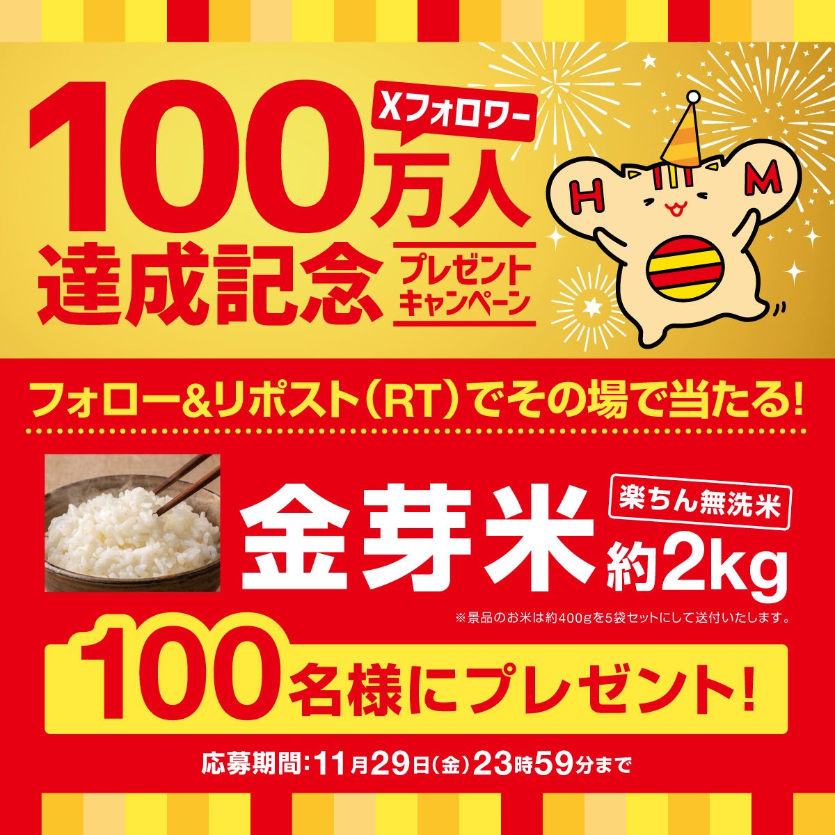 このたび「ほっともっと」では、公式Xのフォロワーが100万人を達成しました。100万人フォロワー達成を記念して、日ごろより「ほっともっと」をご利用いただいているお客様へ、11月29日(金)の1日限定で、「ほっともっと」の“金芽米”がもらえるキャンペーンを実施いたします。