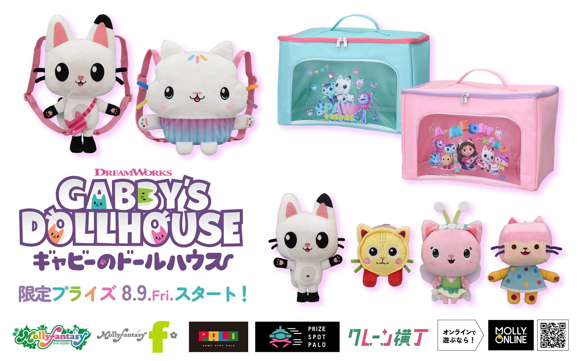 株式会社イオンファンタジー(本社:千葉県千葉市表取締役社長:藤原徳也、以下、当社)は、テレビ東京系列6局ネットにて毎週日曜日、朝9時から放送のアニメ『ギャビーのドールハウス』の当社限定プライズゲーム用景品3アイテムを「モーリーファンタジー」「PALO」をはじめとするアミューズメント施設、オンラインクレーンゲーム「モーリーオンライン」等において8月9日(金)より順次展開いたします。