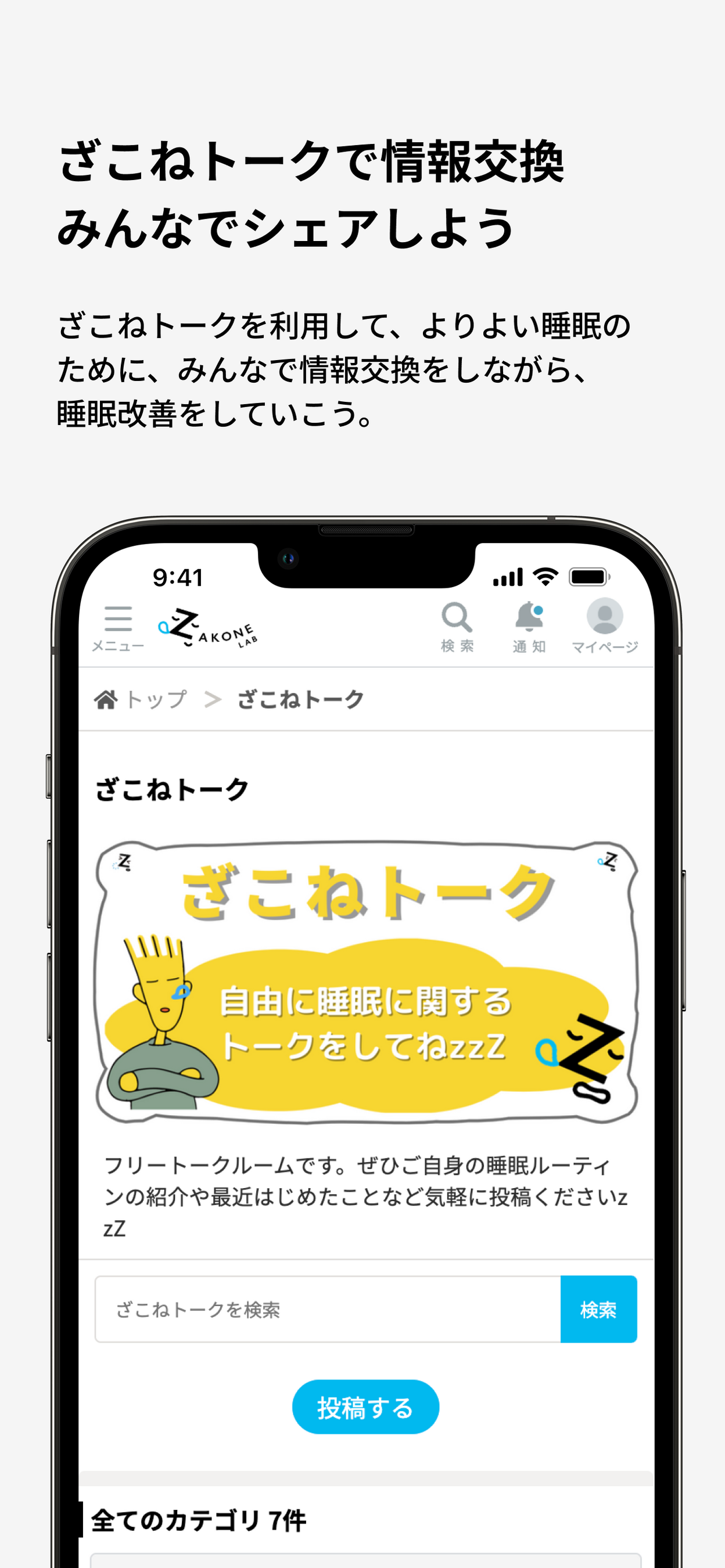 ・トークルーム:ZAKONE LAB参加者同士で自由に睡眠に関するコミュニケーションチャットが可能。