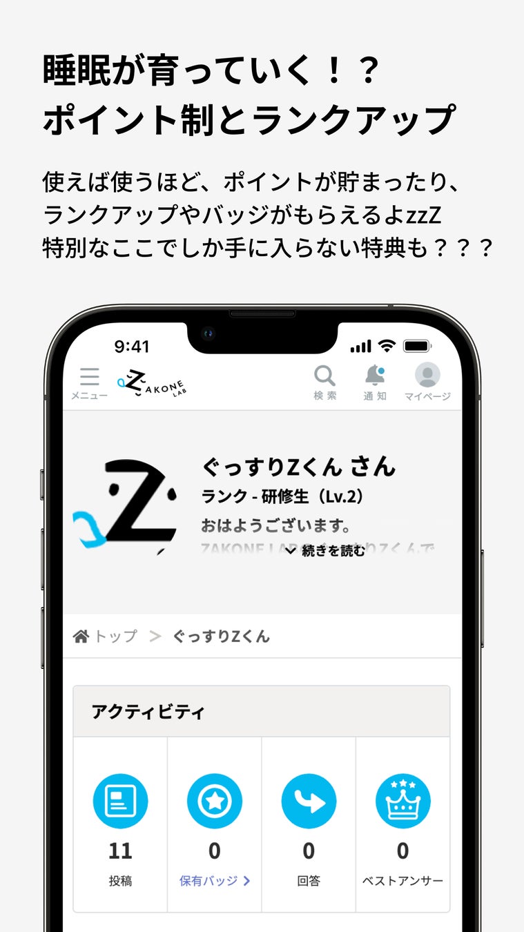 アプリケーション/WEBサイトに搭載するコミュニティ機能や睡眠データ記録機能等の活用により、情報の取得にとどまらず、睡眠改善の実践につなげることをめざしたコミュニティサービスとなっていることが「ZAKONE LAB」の特徴です。