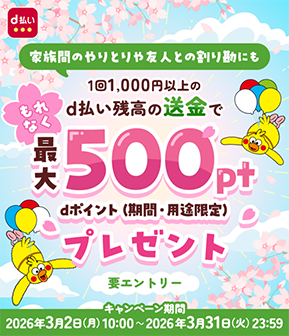 株式会社 NTT ドコモ(以下、ドコモ)は、「d払い残高へのチャージ&d払い残高からのお買物でポイントが抽選で最大10,000ptもらえる!キャンペーン」および「d払い残高の送金で最大500ポイントプレゼントキャンペーン」を 2026年3月2日(月)から 2026年3月31日(火)まで開催します。