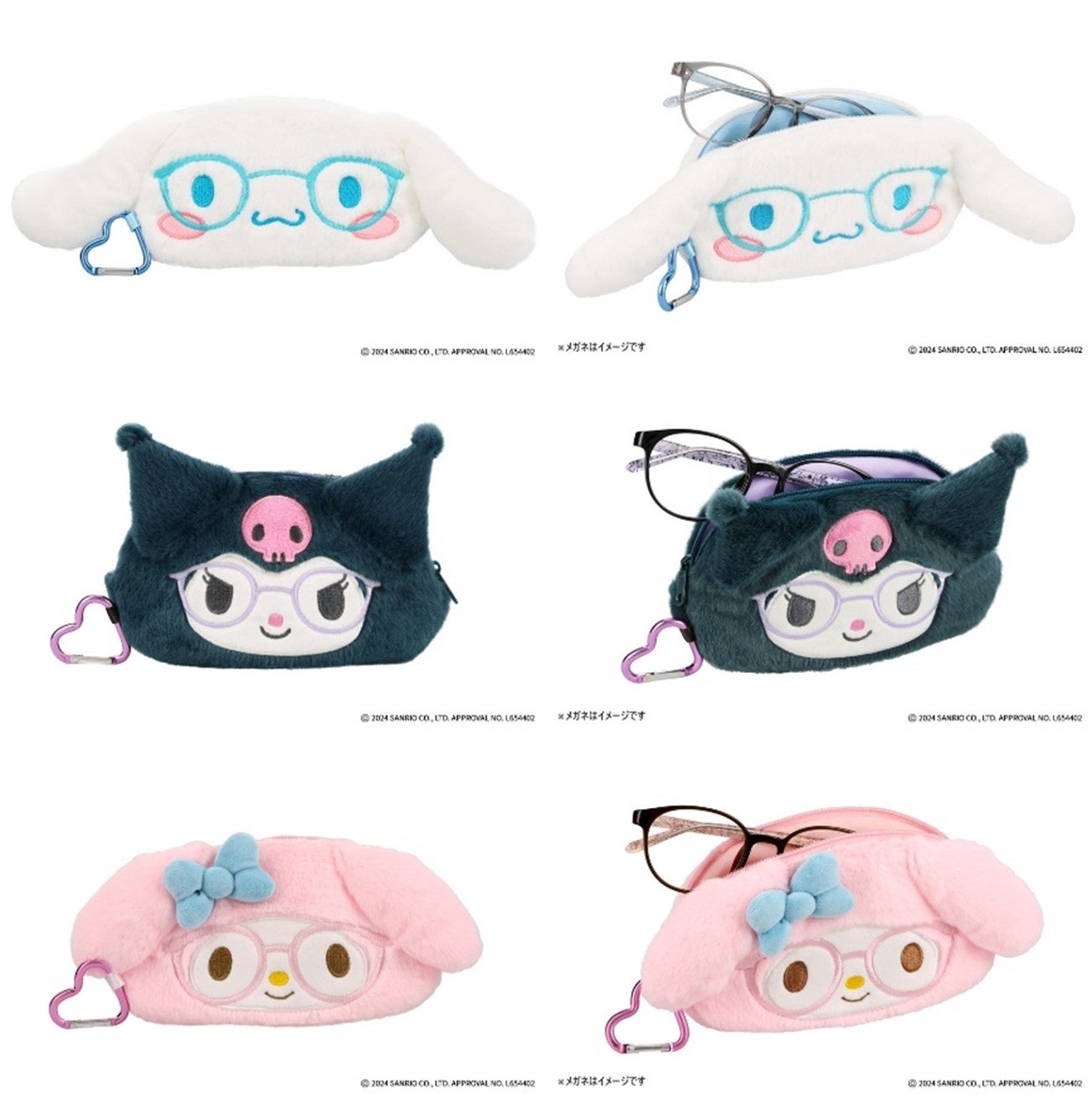 種類、価格|メガネ 各キャラクター12種 全36種 ¥7,700~¥15,500(セットレンズ代込)、サングラス 各キャラクター5種(WEB限定3種含む)全15種 ¥13,300~¥15,500、ダイカットメガネ拭き ¥900、マスコットクリーナー ¥1,600、メタルチャームつきメガネケース ¥2,000、ふわふわメガネケース ¥2,800 ※すべてのメガネとサングラスに各キャラクターのオリジナルケースとメガネ拭き付き