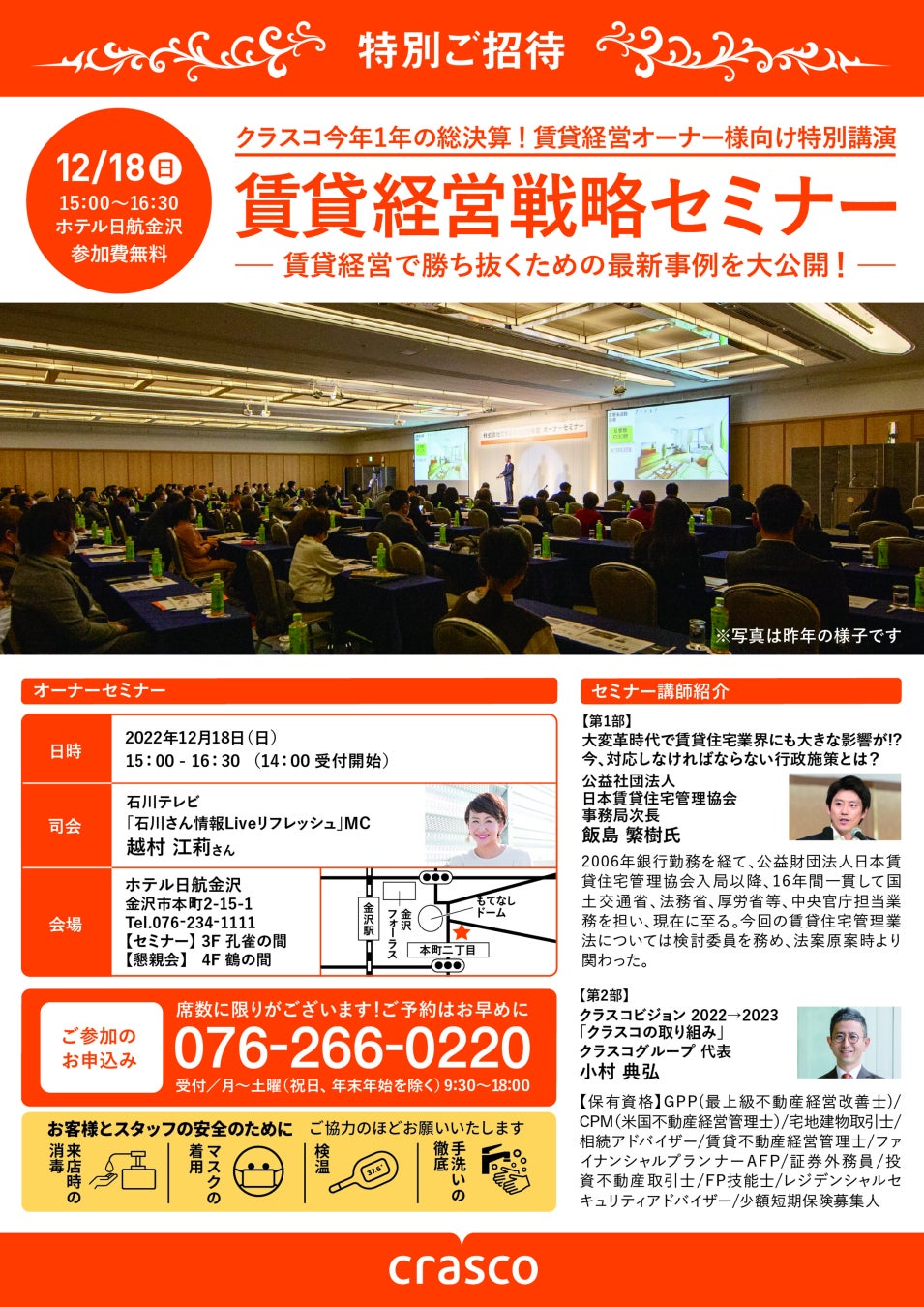株式会社クラスコ(本社:石川県金沢市/代表取締役社長:小村典弘 以下、クラスコ)は、2022年12月18日(日)にホテル日航金沢 孔雀の間(石川県金沢市)にて、クラスコ年間最大のオーナーセミナー「賃貸経営戦略セミナー」を開催いたします。