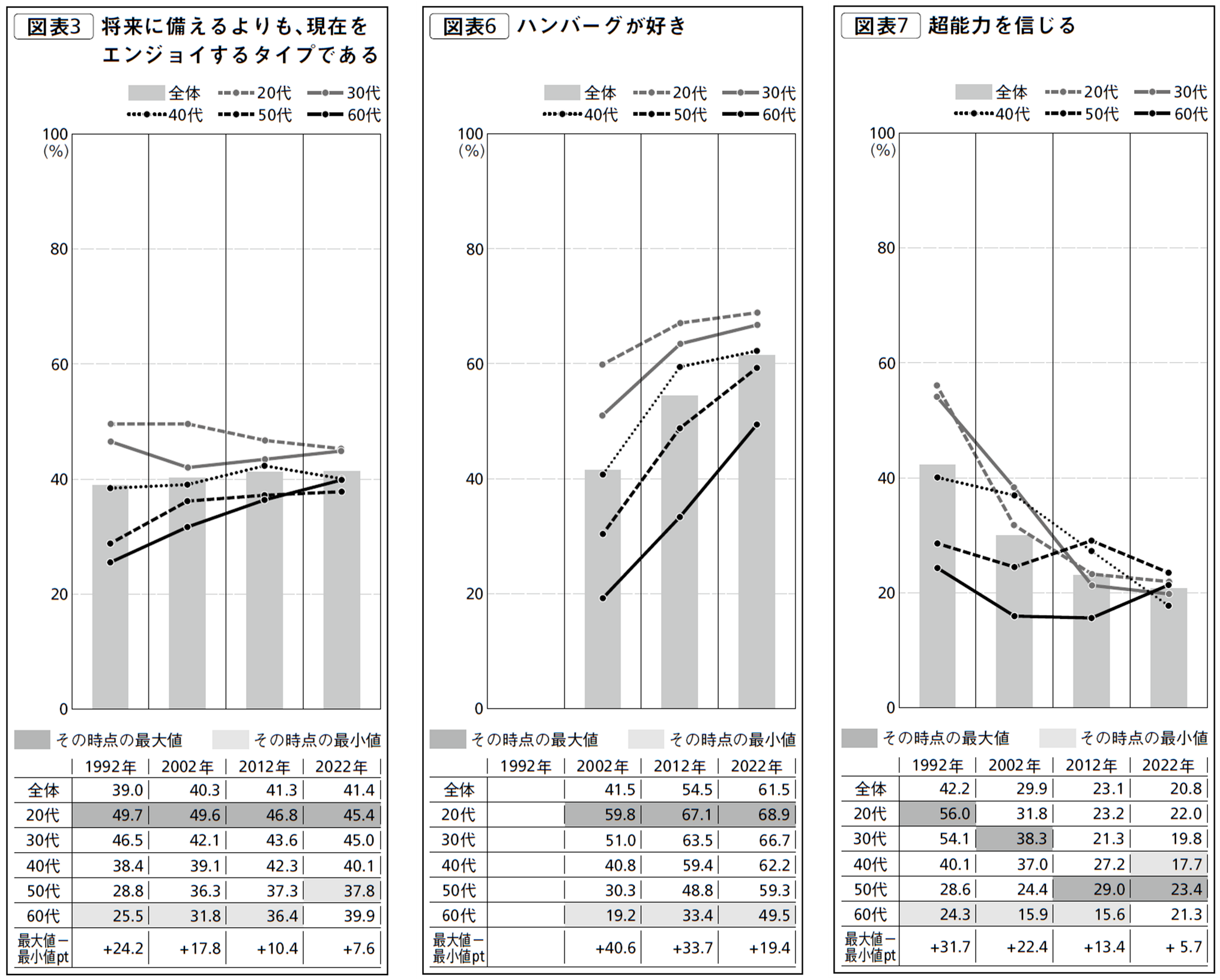 「生活定点」のグラフに注目してみると、1992年から2022年にかけて、さまざまな項目で、年代間の数値差がなくなり、違いが小さくなっているという特徴がわかりました。この興味深い現象を生活総研は「消齢化」と名付け、本格的な研究がはじまりました。
