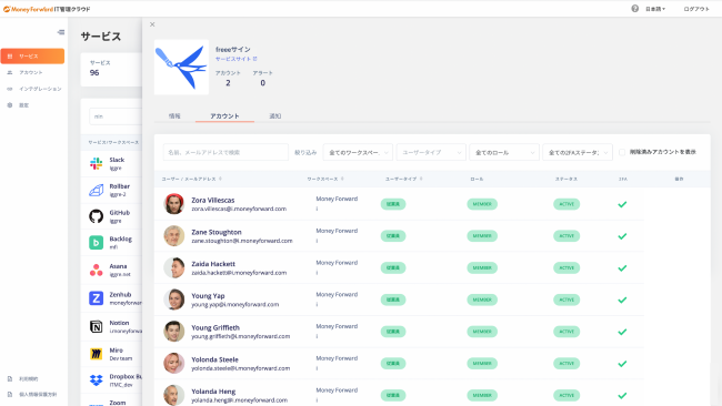 今回の連携により、『マネーフォワード IT管理クラウド』上で『freeeサイン』アカウント利用状況が可視化できることにより、アカウントの一元管理を容易にします。なお、連携はfreeeサイン APIを利用しており、APIオプションの申し込みや追加費用なしでご利用いただけます。