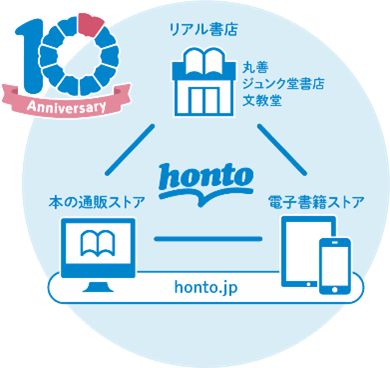 「honto」は、ネット書店(本の通販ストア、電子書籍ストア)と、丸善、ジュンク堂書店、文教堂などのリアル書店を連携させた総合書店として2012年5月にサービスを開始し、2022年5月でサービス開始から10周年を迎えました。