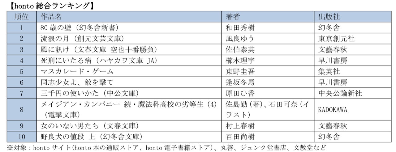 5月総合ランキングでは、第1位に和田秀樹さん『80歳の壁(幻冬舎新書)』がランクインしました。3月末に刊行された本書は発売2週間時点で増刷を重ねるほど売り上げが好調。メディアで紹介されたことによりさらに人気となっています。hontoでは特にリアル書店での売上が好調で男性にうけているようです。