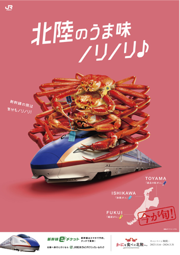 JR東日本では、冬に『旬』を迎える「北陸のかに」 の魅力を伝えるために、今回で7回目となる 「かにを食べに北陸へ。」キャンペーンを展開しています。駅や車内での目を引く宣伝展開により「北陸のかに」の魅力を伝えるとともに、旅行会社や地域の方々と連携して「北陸のかに」を食べに行く旅をご提案します。この機会に北陸新幹線でぜひお出かけいただき、「北陸のかに」の美味をご堪能ください。