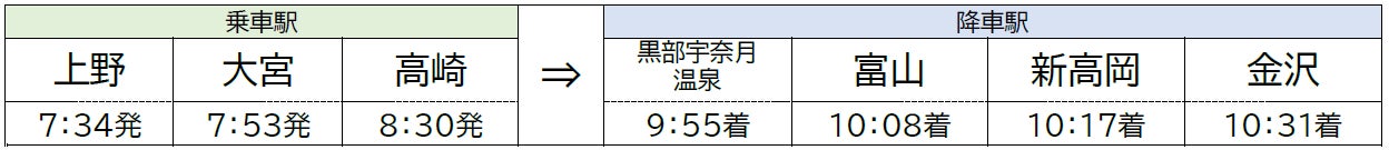 大宮、高崎、黒部宇奈月温泉、富山、新高岡
