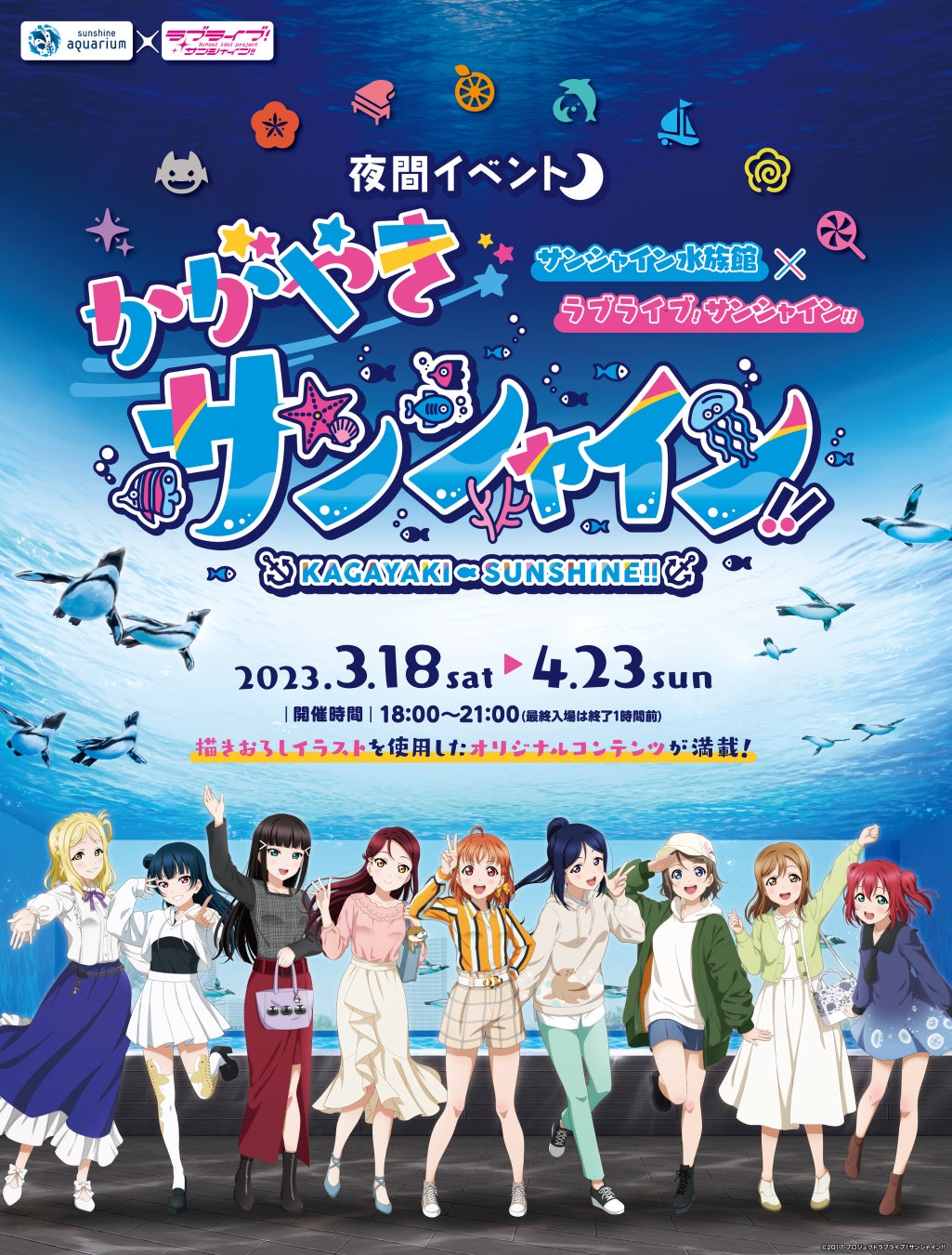 サンシャイン水族館(東京・池袋、館長:丸山克志)は、ラブライブ!シリーズ第2弾にあたる「ラブライブ!サンシャイン!!」とのコラボイベント「夜間イベント サンシャイン水族館×ラブライブ!サンシャイン!! かがやきサンシャイン!!」を3月18日(土)~4月23日(日)まで開催します。