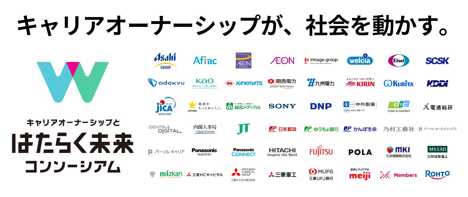 こうした状況の中で、一人ひとりの個人が、自律的に成長し続けるために不可欠なのが「キャリアオーナーシップ」。はたらく個人の力を最大化させ、社会の力にするために、企業は個人とどう向き合い、新たな関係性をつくっていくべきなのか?まだ答えのない問いに対し、先駆的に取り組む企業が自ら実践・実証し、企業と個人の持続的な成長を実現する「はたらく未来」を模索していくのが本コンソーシアムです。