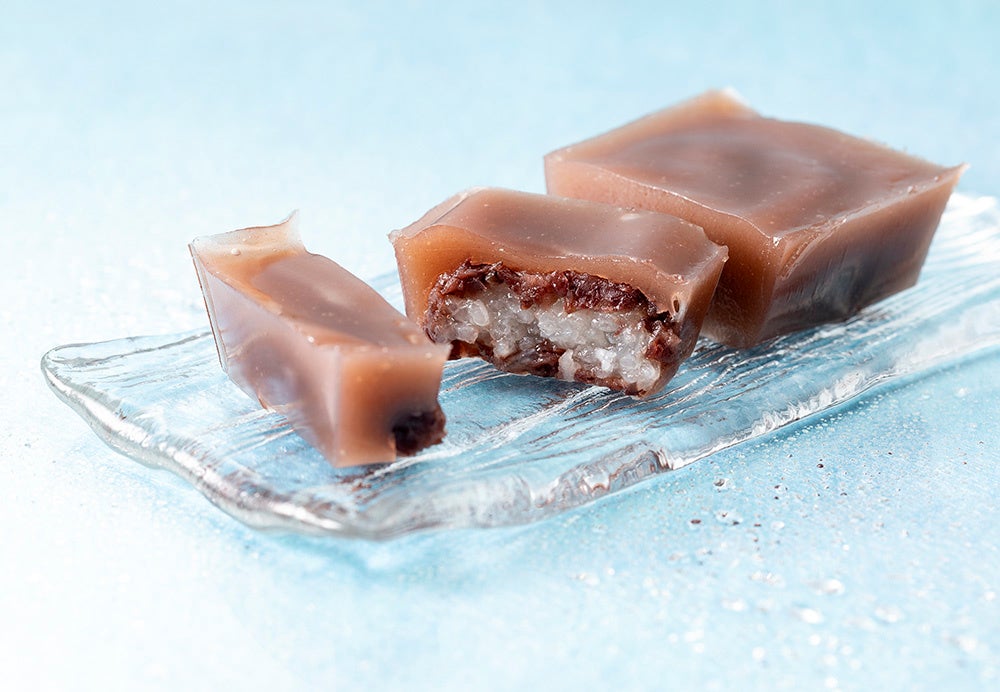 きりっと角の立った特製おはぎ。冷やして美味しいのは、つるりと瑞々しい水羊羹で薄くくるんでいるから。水ようかんの中には風味豊かな「北海道あずき」と、もちもちに搗きあげた「満月もち米」でこしらえた“ 特製おはぎ ”を、2個丸ごとイン!年々猛威をふるう夏の暑さにあわせて、おはぎも進化させました。さっぱり滑らかなくちあたりがクセになる、新感覚のおはぎです。