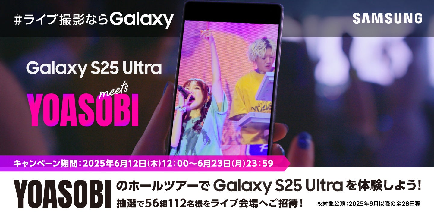 そしてこの度、YOASOBI が2025年7月より開催する国内ホールツアー「YOASOBI HALL TOUR 2025」でもコラボレーションが実現しました。「Samsung Galaxy S25 Ultra」をレンタルし、実際に撮影体験しながらライブを楽しめるご招待チケットキャンペーン『#ライブ撮影ならGalaxy 「Galaxy S25 Ultra meets YOASOBI」 YOASOBIのホールツアーでGalaxy S25 Ultraを体験しよう!』を本日2025年6月12日(木)12:00より開始することになりました。