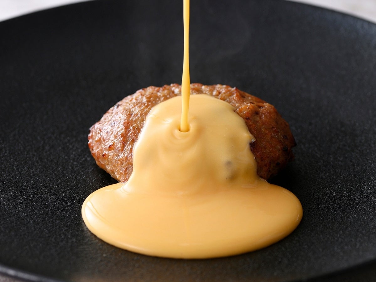 ジューシーで旨味たっぷりの肉汁と、12種類ブレンドした濃厚なチーズが溢れる、現在ご提供中のチーズインハンバーグに、爽やかな酸味とマイルドな味わいの『とろりチーズソース』を上からたっぷりと!