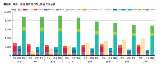 音楽市場の推定総売上金額は6,410.7億円に達し、2019年のストリーミング調査開始以来、最高の売上実績を記録しました。ストリーミングが日常的な音楽消費の基盤として定着し、ヒット楽曲の長期的な再生がデジタル市場の拡大を支えている印象です。一方、映像市場は配信サービスの普及に伴う視聴スタイルの変化を受ける中、音楽ジャンルが構成比50%超と存在感を示しました。また、書籍市場は文庫・コミックを除く「BOOK」の売上が前年を上回る結果となりました。