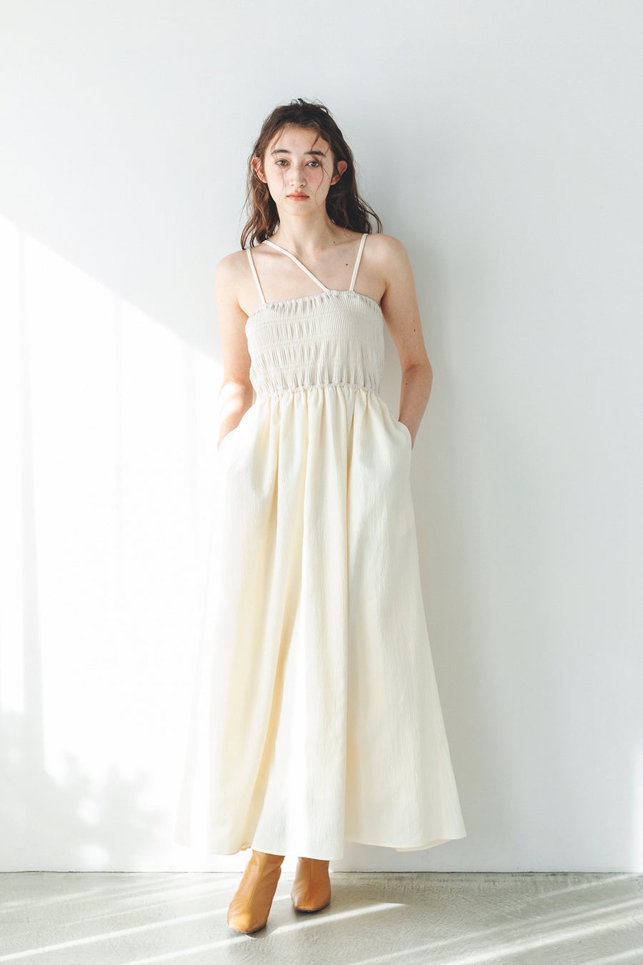 アシンメトリーなストラップデザインがポイントのキャミワンピース。