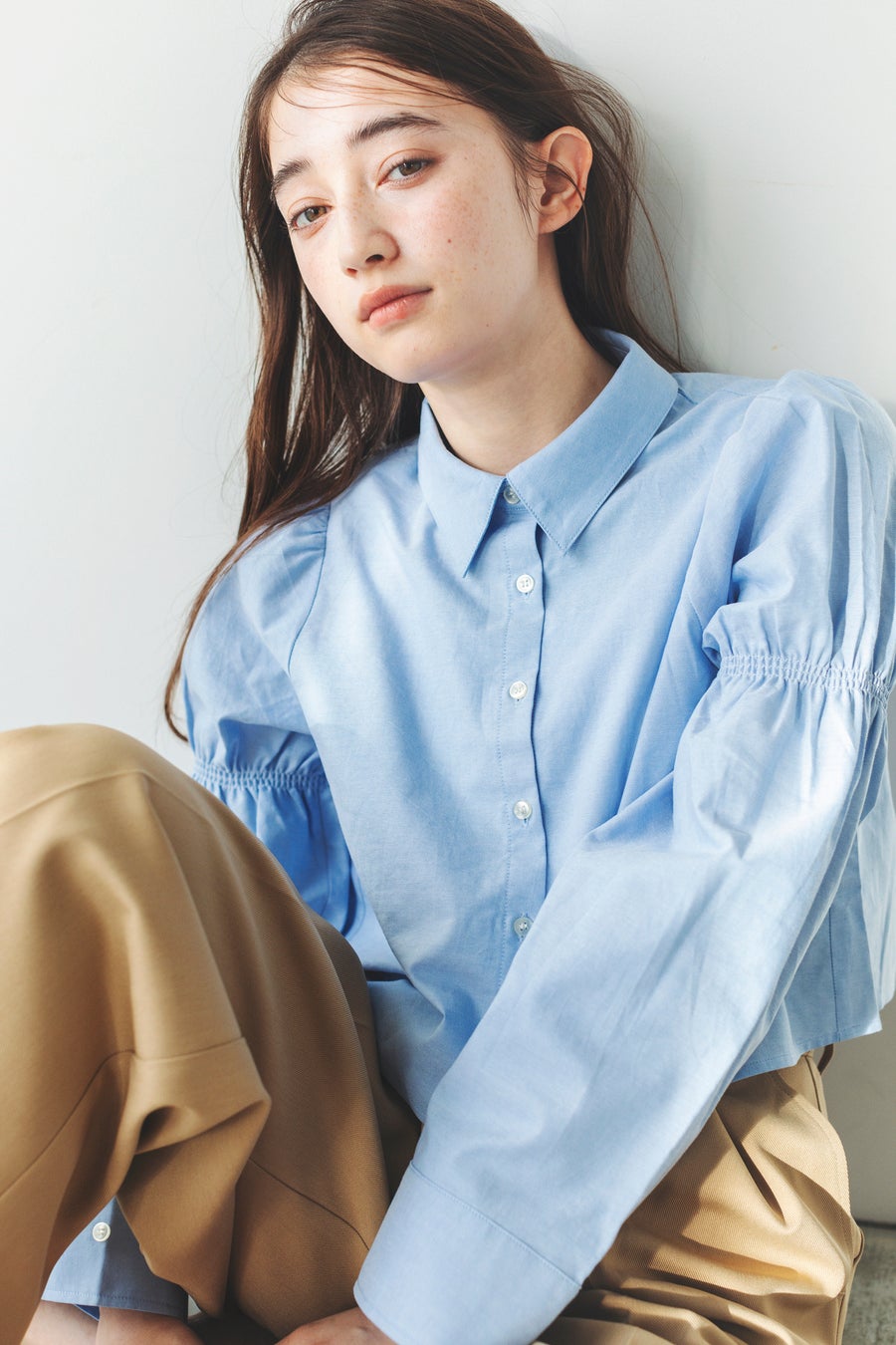 くしゅっとしたシャーリングが愛らしさをプラスするシャツ。