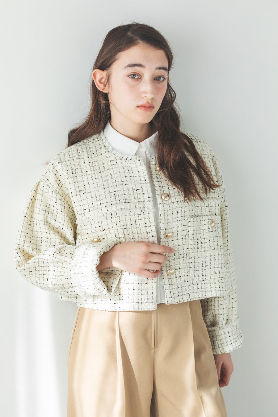 中でも注目アイテムは、大人なエッセンスをプラスしてくれるツイードジャケットです。トレンドのショート丈を採用し、so4uらしい柔らかなオフとベージュの2色をご用意いたしました。アクセントにプラスした金ボタンもポイント。カジュアルスタイルはもちろん、オフィススタイルにも活躍いただけるアイテムです。