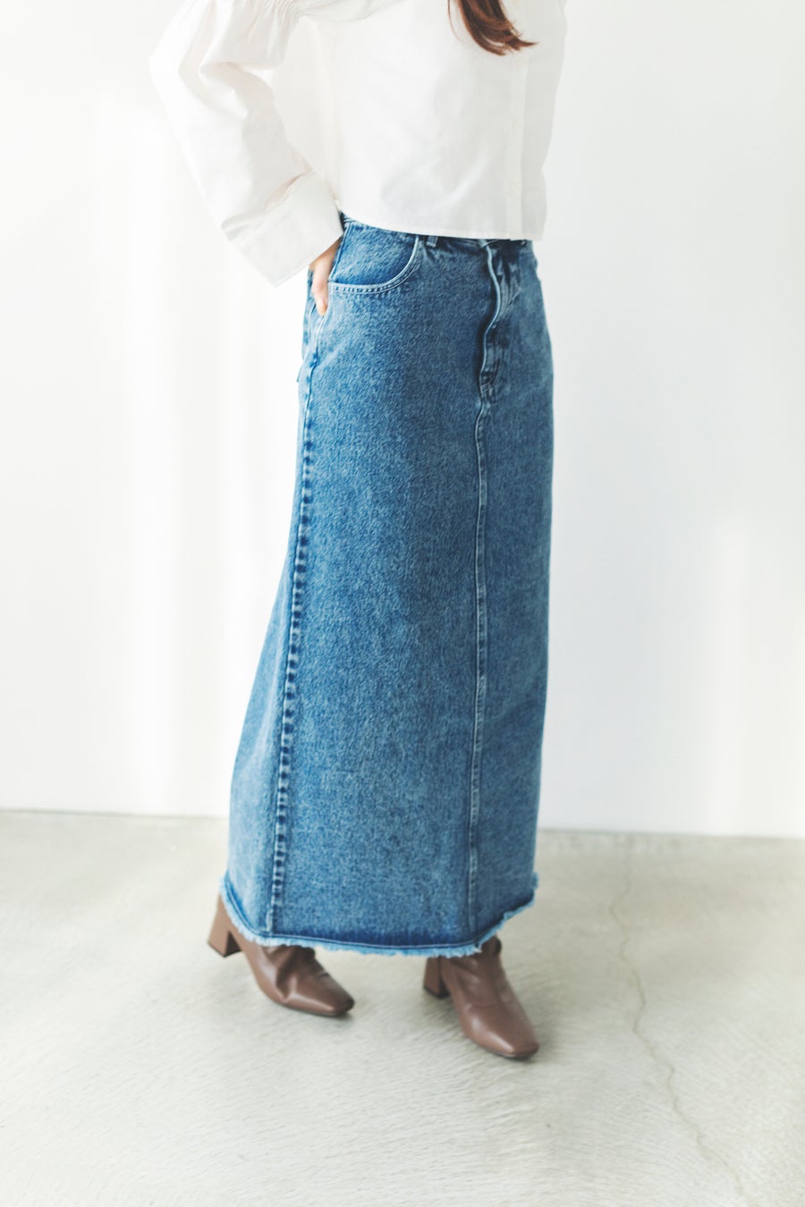 すっきりとタイトに仕上げたデニムスカート。
