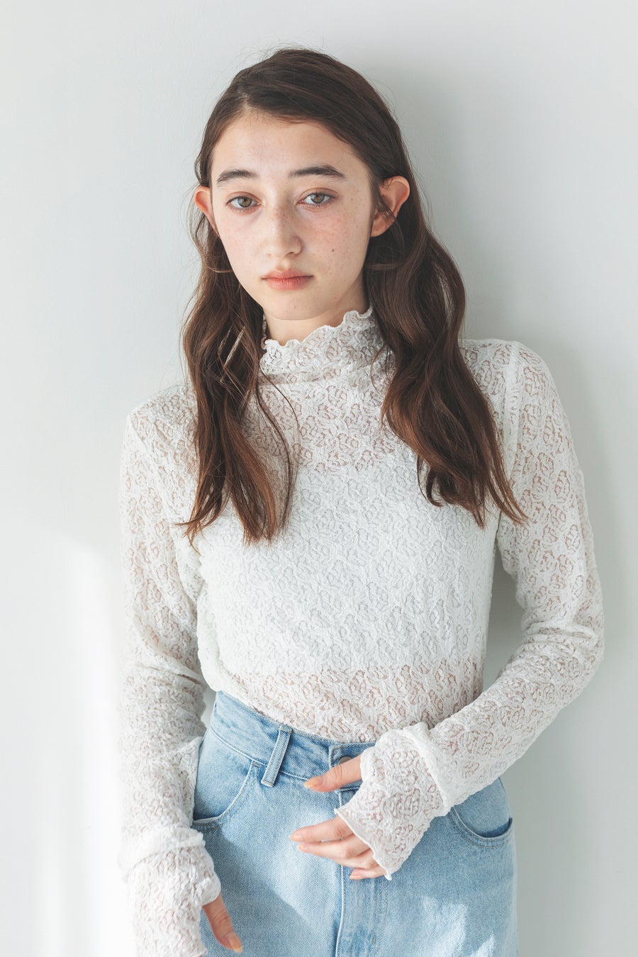 繊細なレースが上品な印象を与えてくれるハイネックトップス。