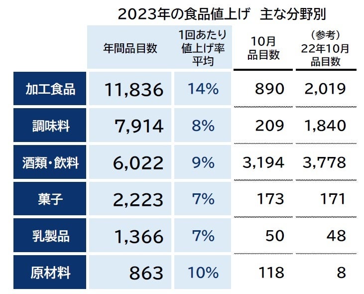 2023年10月の値上げは、「酒類・飲料」(3194品目)が年内最多となった。全食品分野で最も多かったものの、前年同月に比べると8割の水準にとどまった。「加工食品」(890品目)や「調味料」(209品目)なども、前年同月に比べて大幅に減少した。