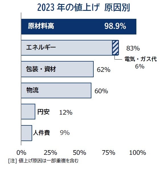今後は、1ドル140円台後半の円安水準長期化により、国際相場で下落した食用油など輸入食材では値下がりの恩恵を受けにくくなる可能性がある。物流費や包装資材の価格高騰が続くほか、高止まりが続く電気・ガス代、原材料では国産海苔の不作など食品価格が安定化するためのプラス要因は見当たらず、24年以降も断続的に値上げが続く可能性が出ている。