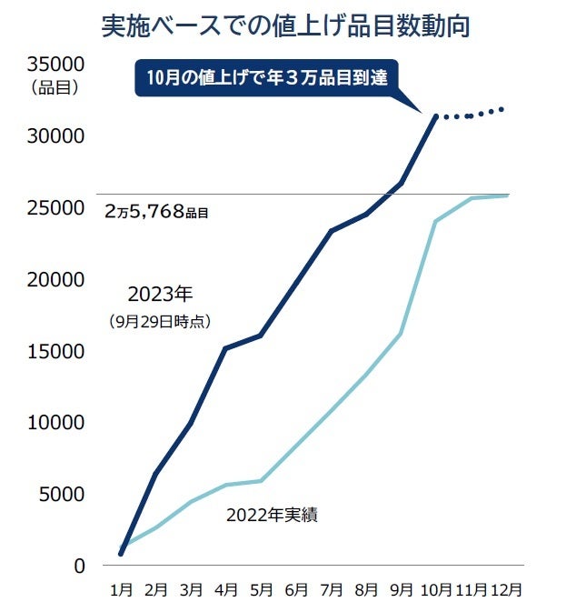 2023年通年の値上げ品目数は、既に実施されたものや今後予定するものを含め、累計で3万1887品目となった。年間累計としては22年の水準(2万5768品目)を大きく上回り、バブル崩壊以降で類を見ない記録的な値上げラッシュとなったものの、急激に値上がりした前年の原材料価格の上昇分について一定の価格転嫁ができた企業が増えていることから、値上げの勢いは23年後半にかけて後退傾向にある。そのため、値上げは10月を一旦のピークとして23年末にかけて小康状態が続くと想定され、当初の年間予想(3万5000品目)をやや下回る3万2000品目台にとどまるとみられる。