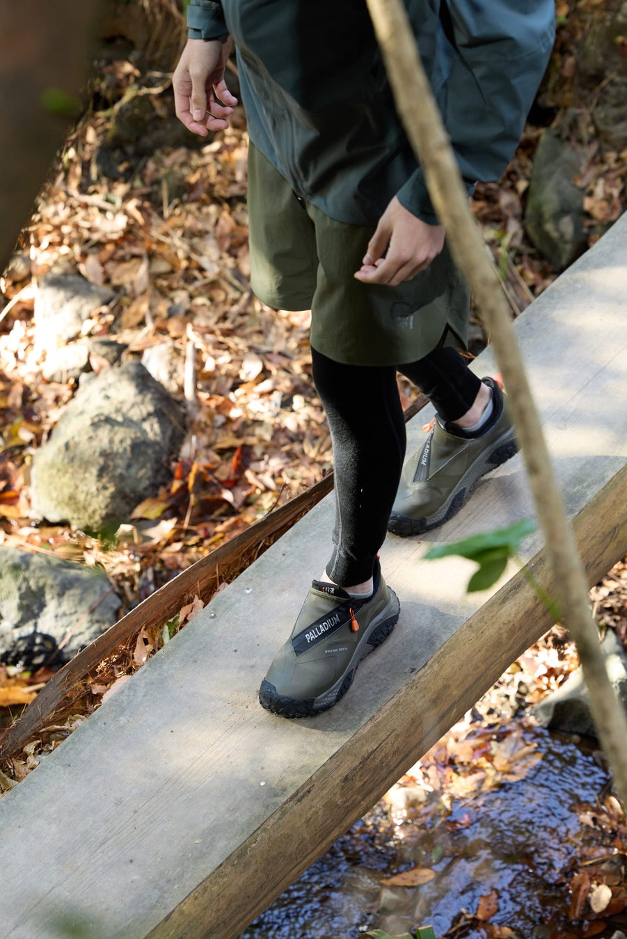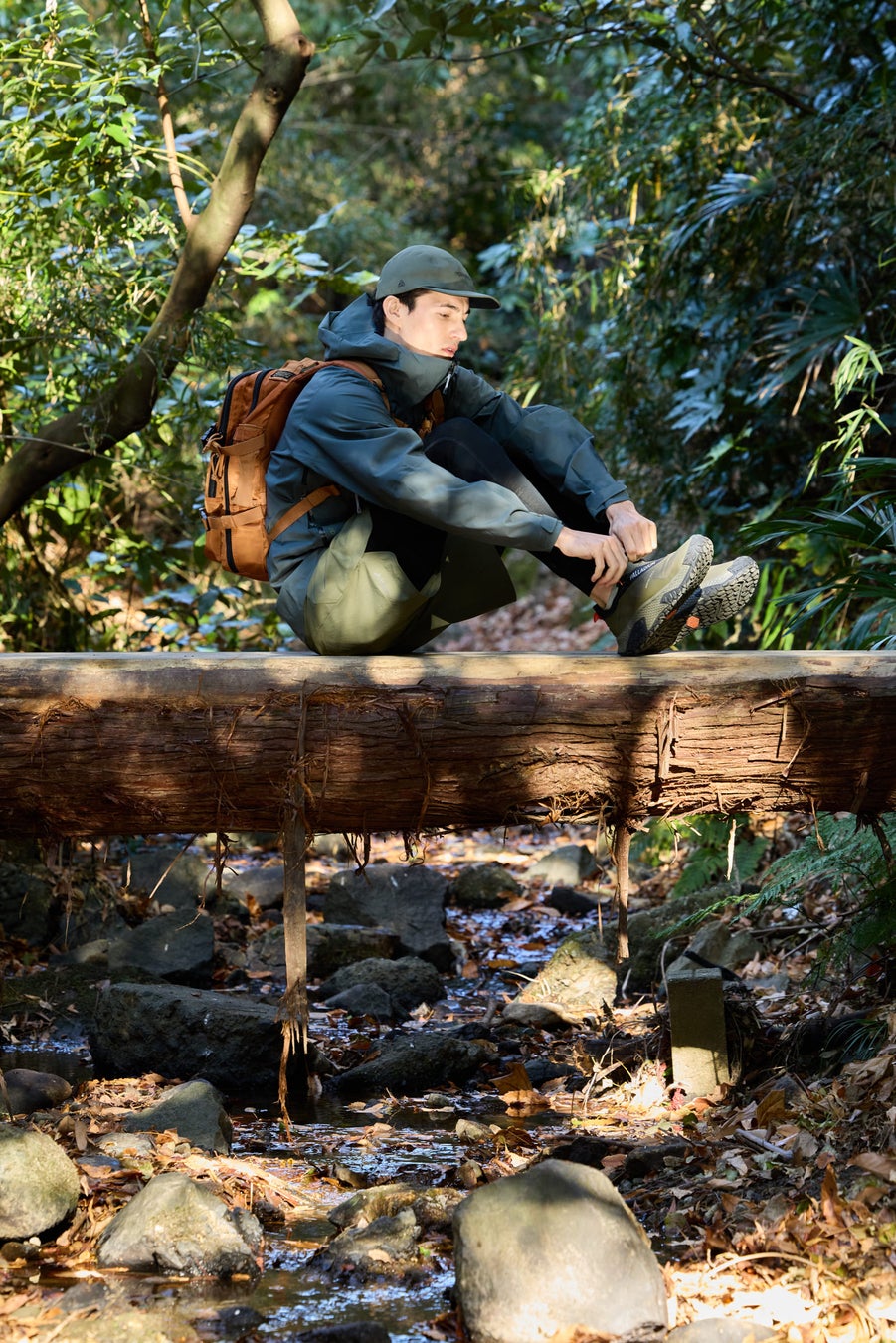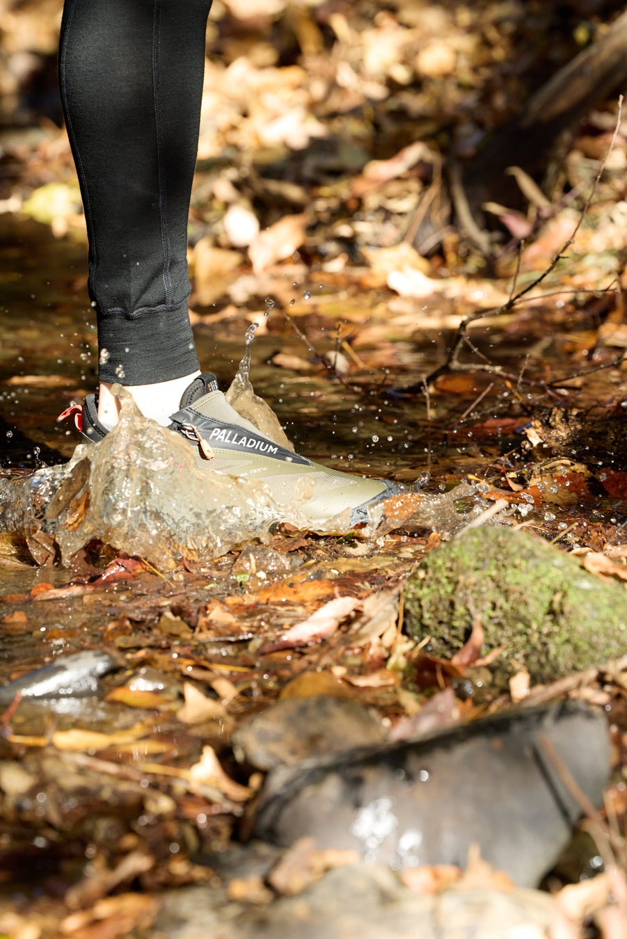 アウトドアで着用できる防水モデルとして行ったフォトシューティングでは、パラディウムのブランドルーツであるミリタリーをオマージュしたトレッキングスタイルに。カラーリングを抑え、スマートかつ機能的にまとめました。