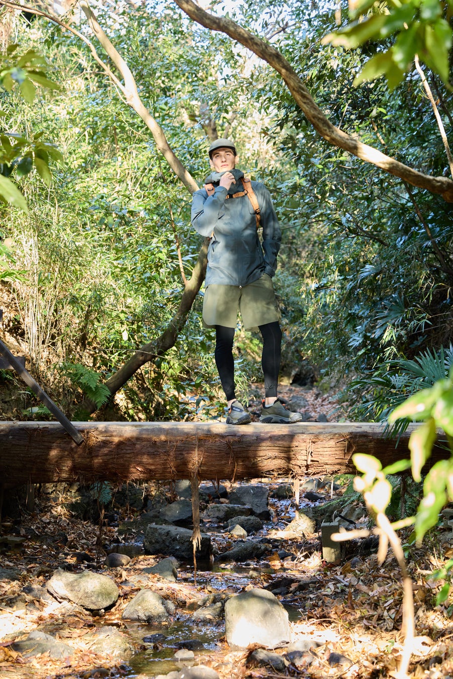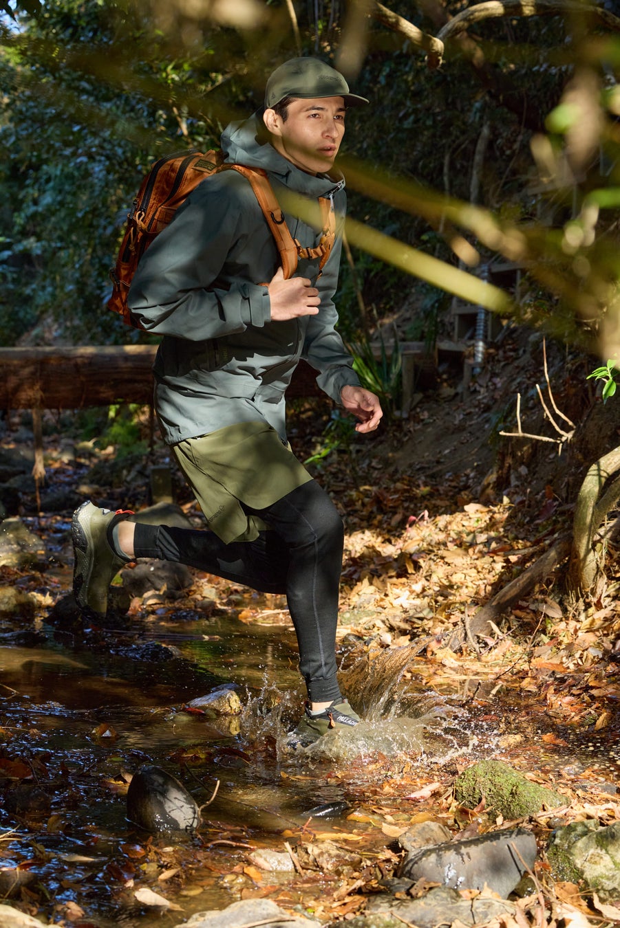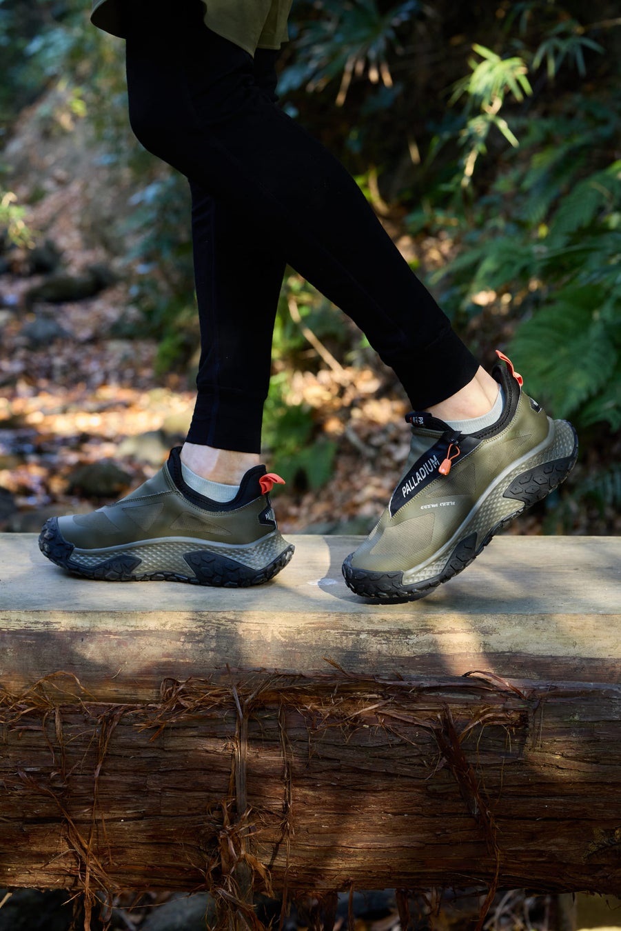 アウトドアで着用できる防水モデルとして行ったフォトシューティングでは、パラディウムのブランドルーツであるミリタリーをオマージュしたトレッキングスタイルに。カラーリングを抑え、スマートかつ機能的にまとめました。