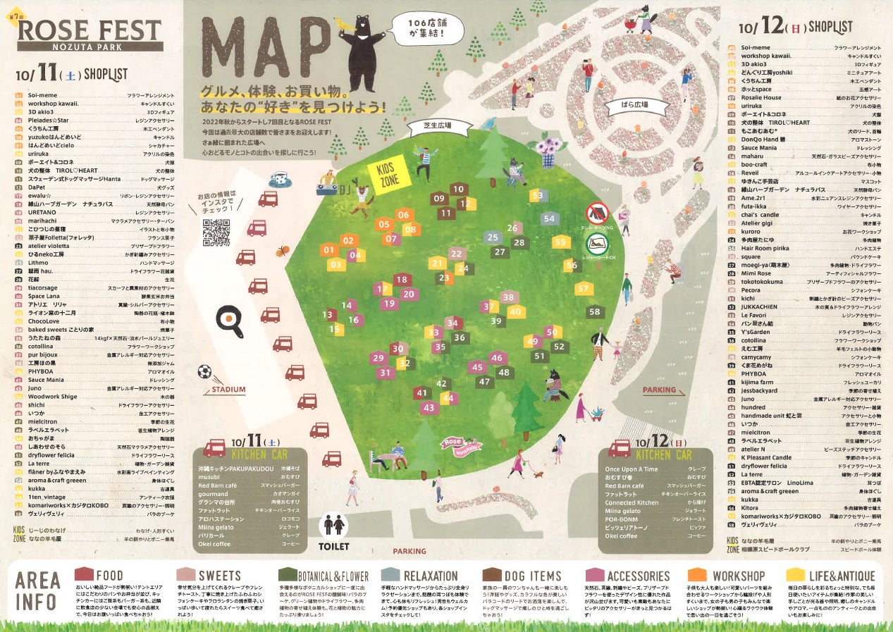 当日は、ばらをモチーフとした雑貨販売、ブリザーブドフラワー、ブーケづくりのワークショップ、ピザ、クレープ、ロコモコなどを販売するキッチンカーなどが出店します。出店者は、町田近隣で活躍するお店や作家さんです。