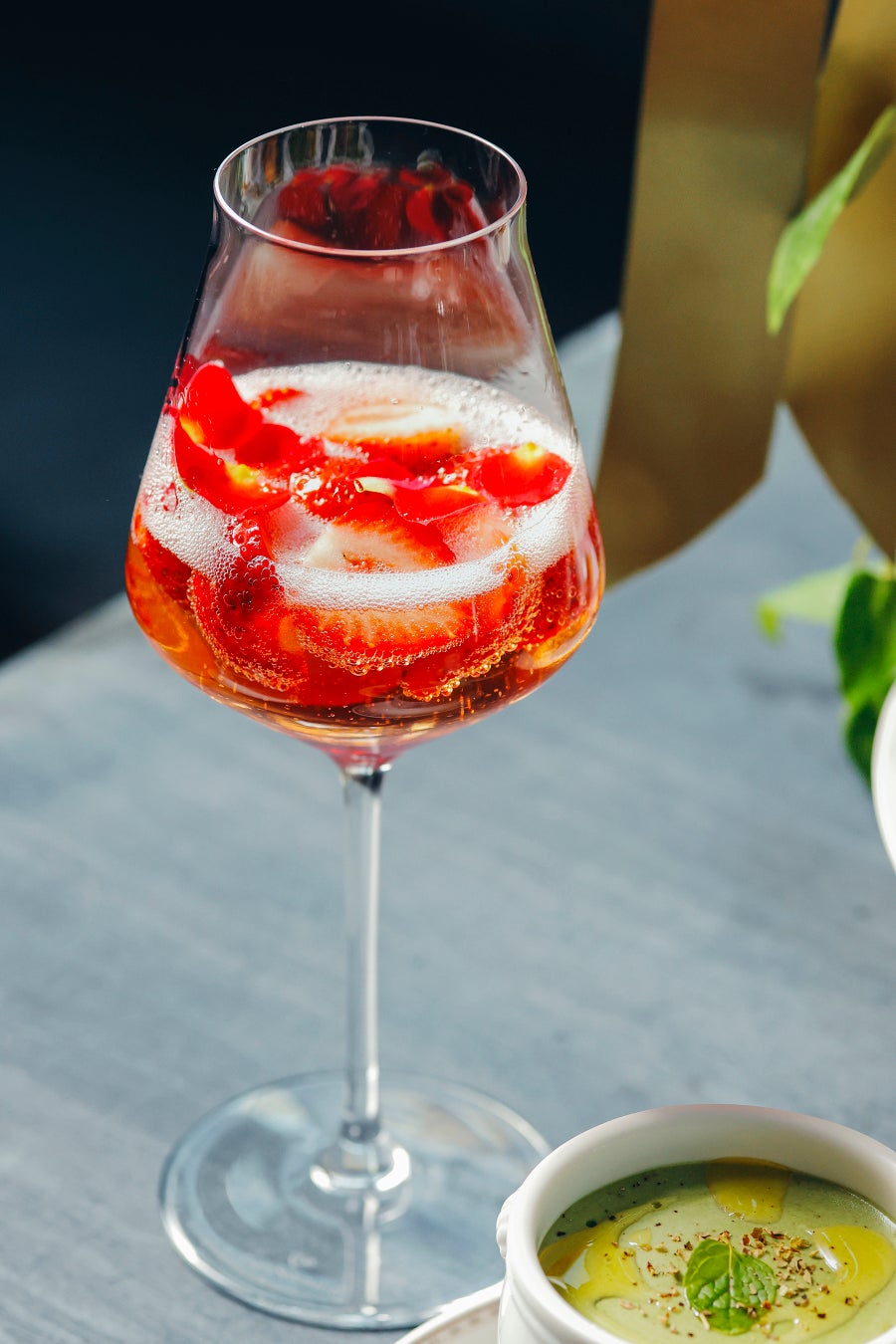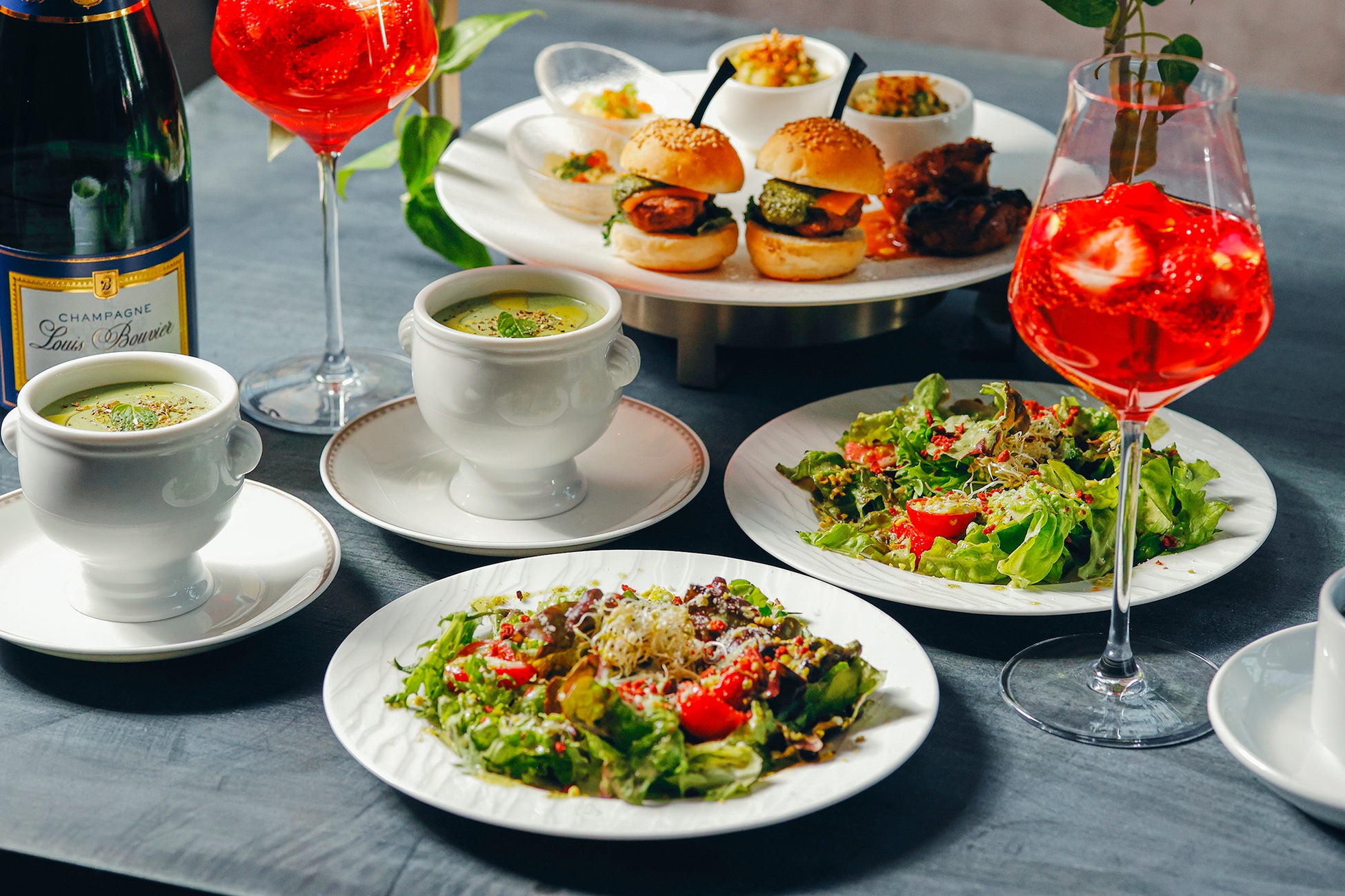 表参道ケヤキ並木が新緑に色づく景色を一望しながら、いちごとピスタチオ、バジルの3つの食材で春の訪れを味わう贅沢なひとときをお過ごしください。