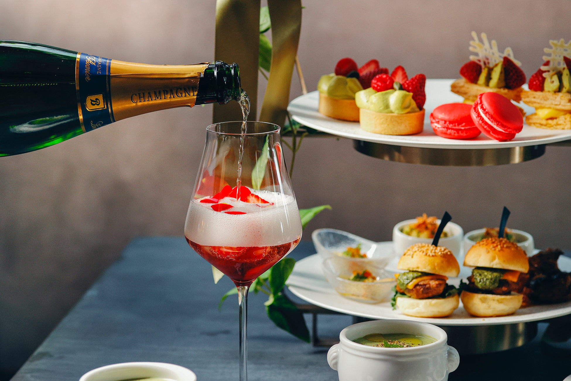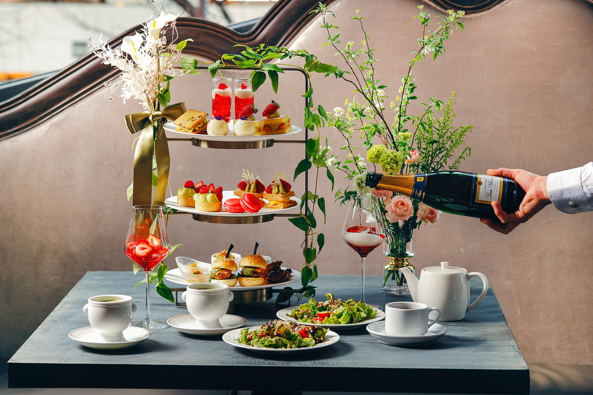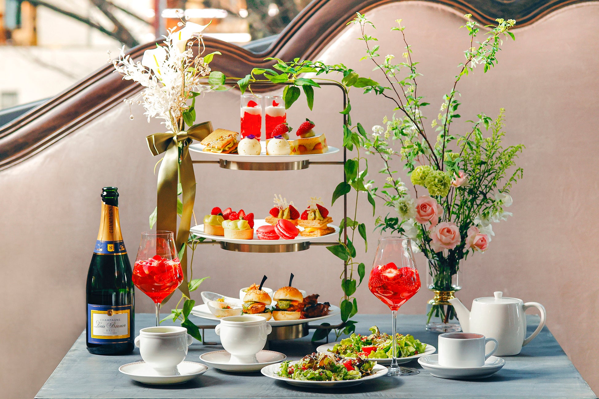 お飲み物はシンガポール創業のラグジュアリーティーブランド TWG Teaの紅茶など全16種類を好きなだけお召し上がりいただけます。また、お酒とともにお楽しみいただけるよう、フレッシュのいちごにローズシロップと花びらを入れ、シャンパンを注いだエレガントなカクテルもオプションで登場します。