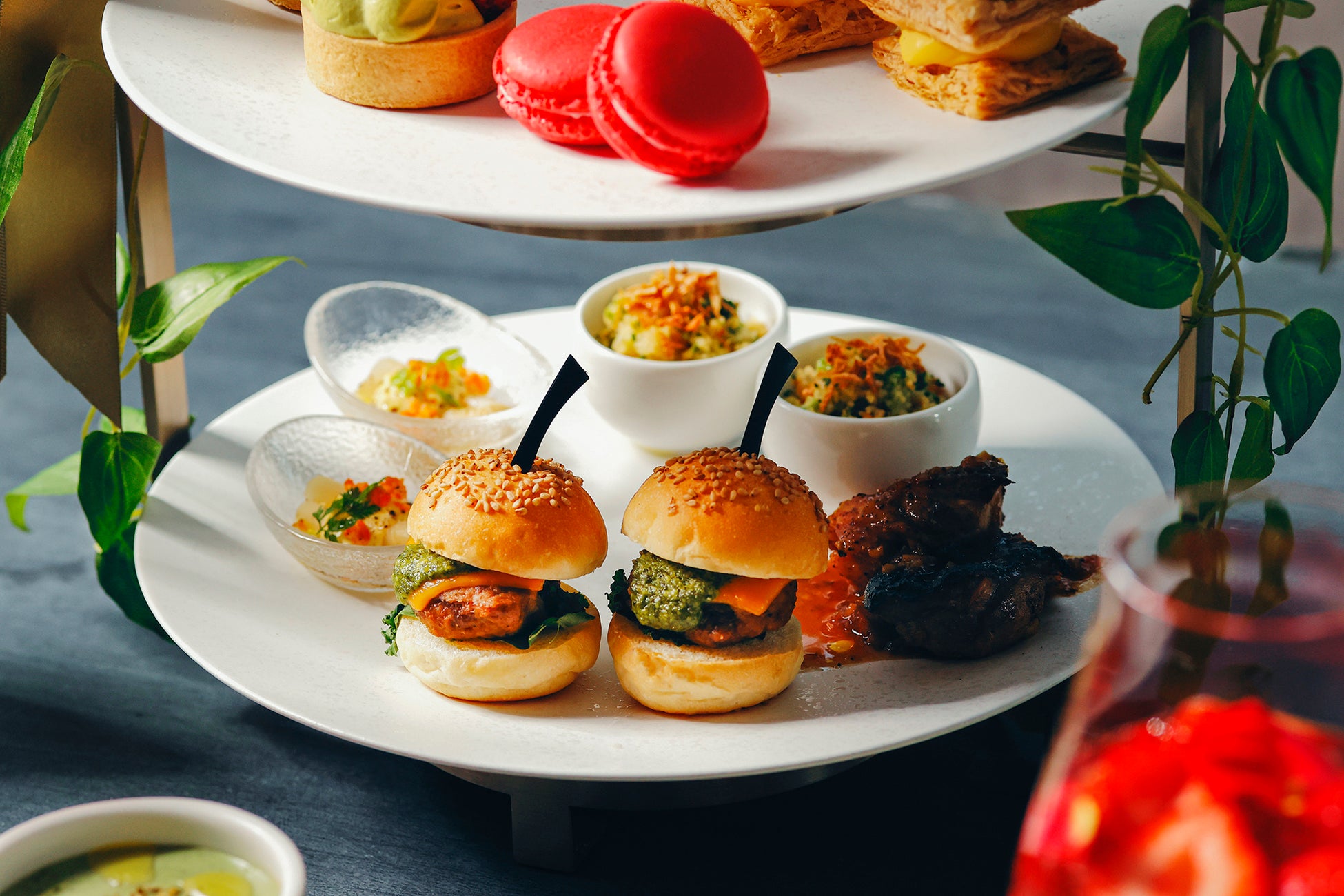 スイーツは、香ばしいピスタチオをふんだんに使用したバタークリームサンドや、サクサクとした食感のミルフィーユ、いちごとピスタチオホイップをのせたタルト、さらにバジルにフロマージュブランのムースを合わせた新感覚スイーツなど7種がラインアップ。セイボリーは、食欲を促進させると言われているバジルのジェノベーゼソースがかかった旨味たっぷりのTAVERN特製ミニバーガーや、スパイシーなチキングリルなど4種に加え、グリーンアスパラガスのポタージュやいちごとピスタチオのサラダも揃えた、旬食材たっぷりのヘルシーかつ満足感溢れる内容でお届けいたします。