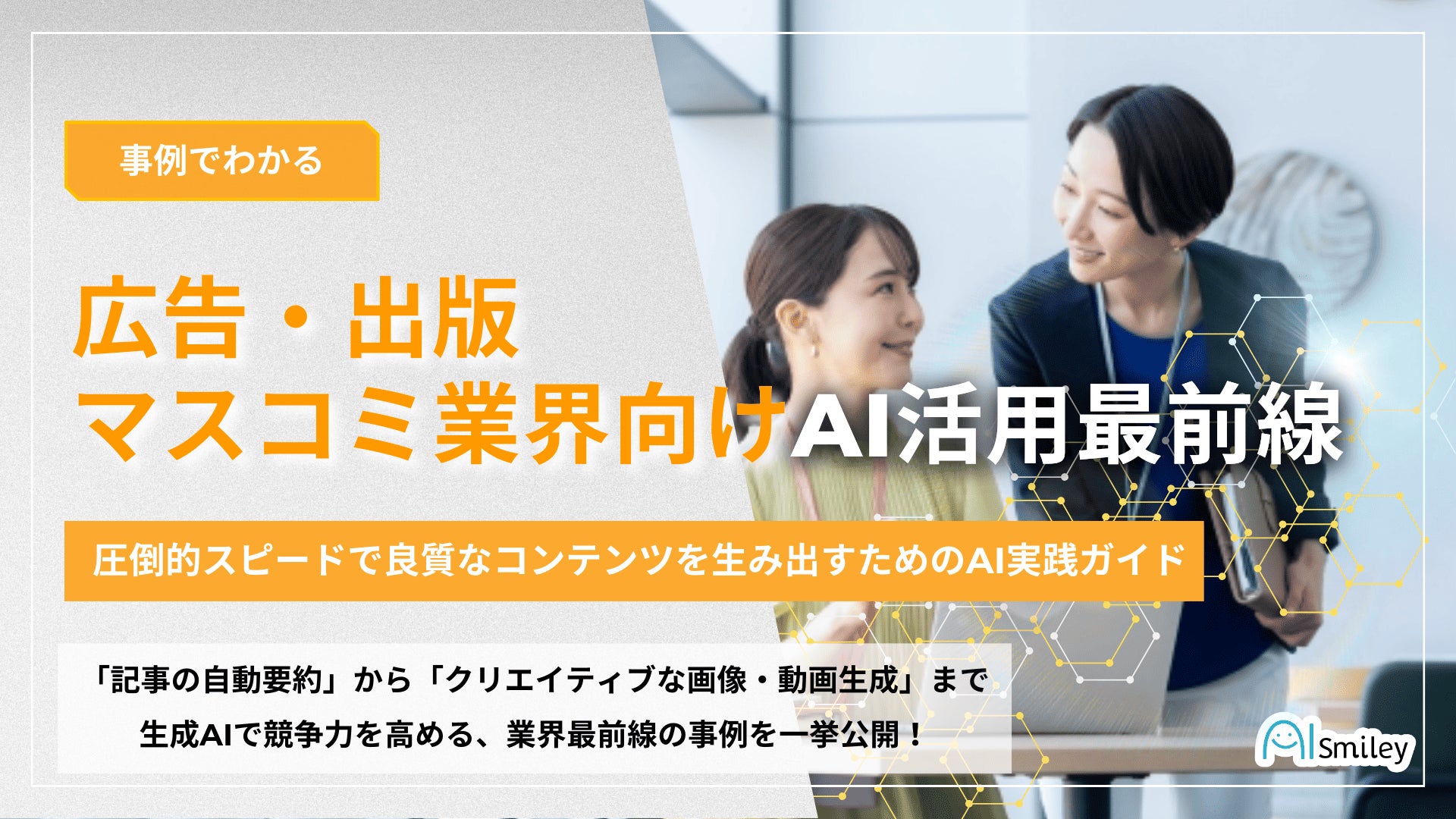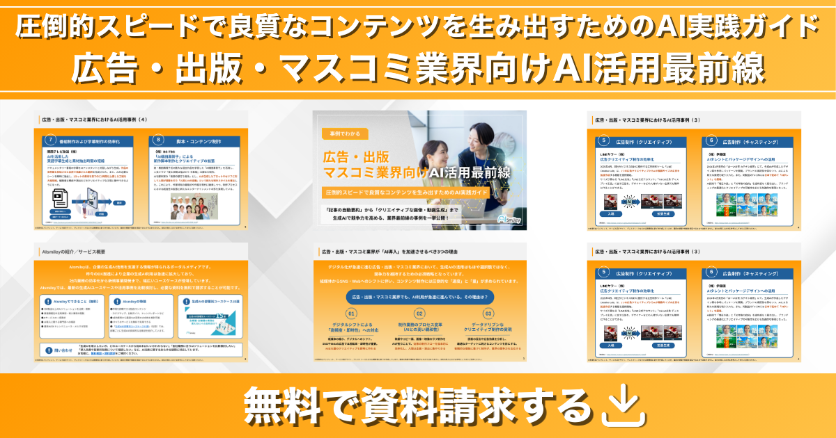 国内最大級のAIポータルメディア「AIsmiley」を運営する株式会社アイスマイリー(東京都渋谷区、代表取締役:板羽 晃司)は、広告・出版・マスコミ業界における最新の生成AIユースケースをまとめた「広告・出版・マスコミ業界向けAI活用最前線」を、2026年3月24日(火)に公開しました。