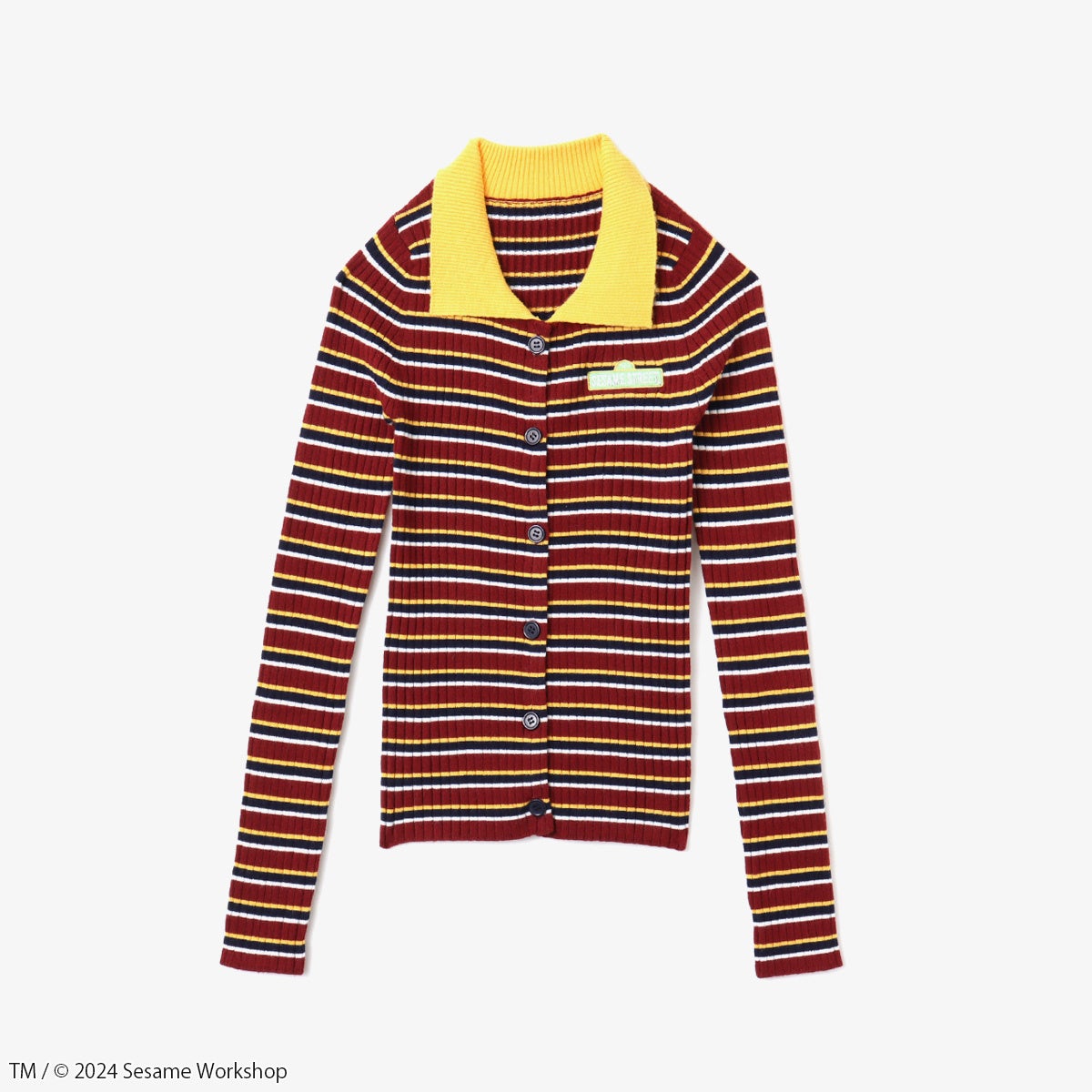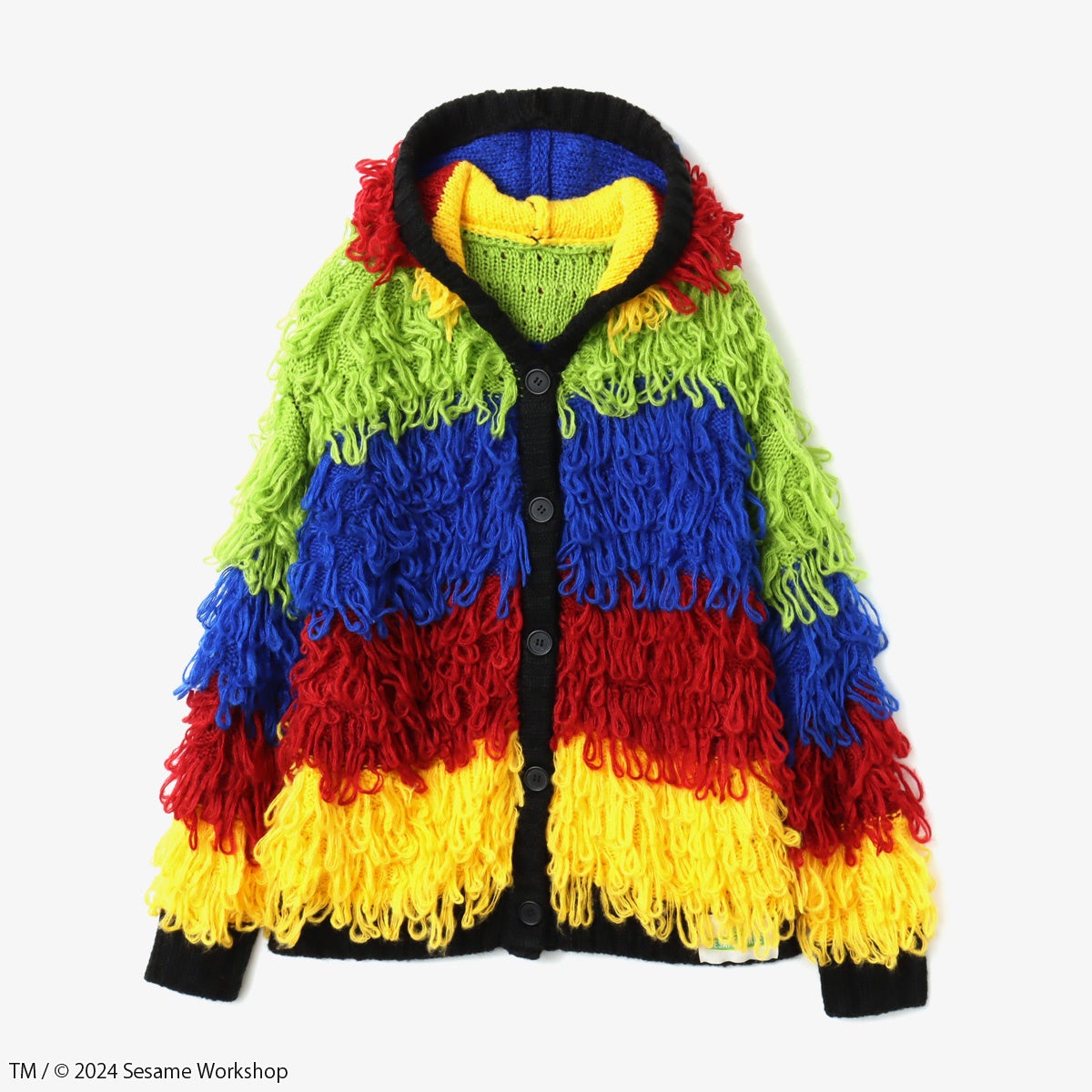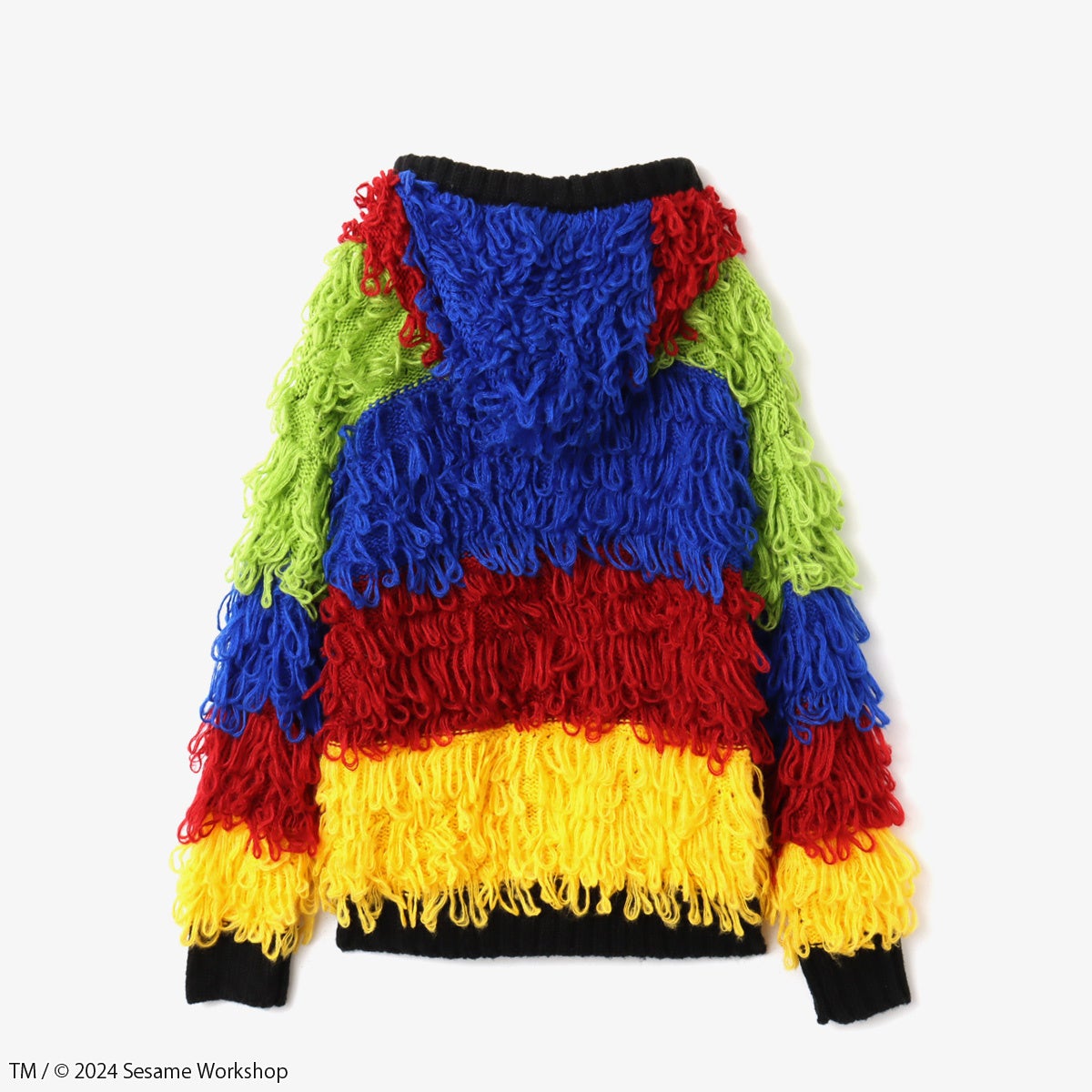 エルモ、クッキーモンスター、ビッグバード、オスカーといった各キャラクターのイメージカラーを使用したループ編みニットカーディガンは、まるでパペットのようなボリューム感と柔らかな肌ざわりが特徴です。また、キャラクターたちが大きくプリントされたスウェットトップスや、バートとアーニーが着ているトップスを彷彿とさせる配色のマルチカラーボーダーニット、エルモとクッキーモンスターのカラーをグラデーションで表現し、それぞれの顔をあしらったモヘア風のニットビーニーがラインナップ。