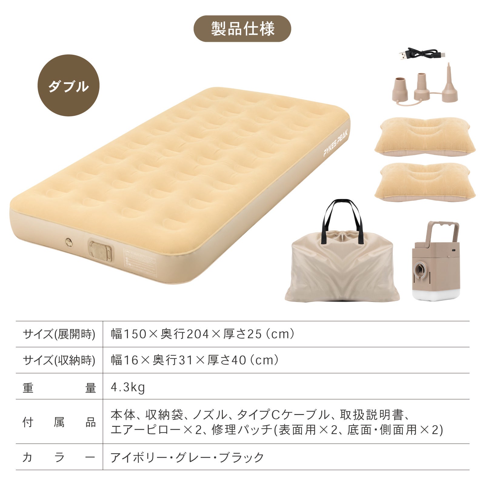 付属品(ダブル):本体、収納袋、ノズル、タイプCケーブル、取扱説明書、エアーピロー×2、修理バッチ(表面用×2、側面・底面用×2)