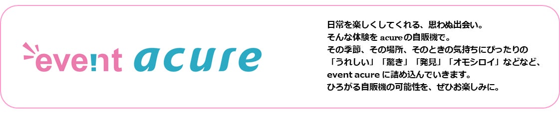 「event acure」は、季節やイベントに合わせてコンセプトを設定し様々な商品を展開していく百貨店の催事のようなものから、コンビニのレジ横のような話題の商品を取りそろえる、新しい形の自販機ビジネスです。飲料だけにとどまらず、さまざまな商品を販売していく予定です。
