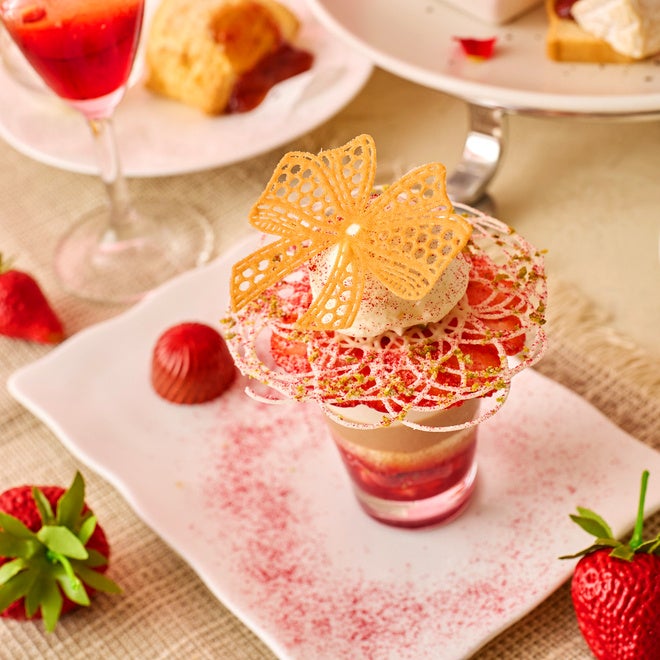 花びらのようないちごと、ラングドシャのリボンやホワイトチョコをあしらい華やかに仕上げたミニパフェ。果肉入りのいちごソースにしっとりしたスポンジ、ふんわり軽い口当たりのチョコクリームや生クリームで味の変化をお楽しみいただけます。