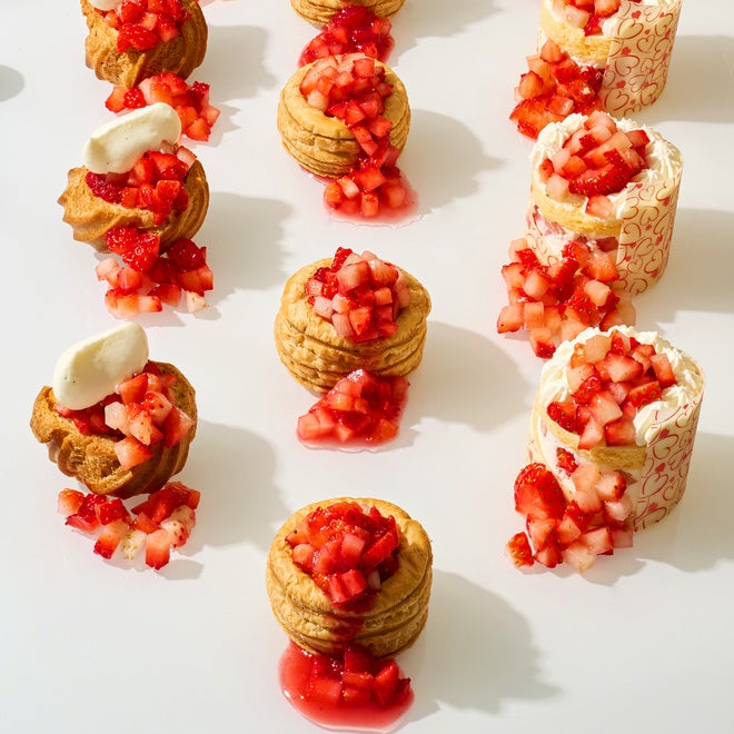 毎年ご好評のいちごを使用したアフタヌーンティーセット。今回は、ショートケーキ・シュークリーム・ボローバンの王道スイーツ3種類を、フレッシュのいちごが溢れ出る“こぼれいちご”スタイルでご用意します。ミルキーで濃厚な味わいの生クリームで仕上げるショートケーキ、濃厚でコクがあるチョコカスタードクリームを忍ばせたシュークリーム、バニラ香るクリーミーな自家製カスタードクリームをたっぷりと閉じこめたボローバンなど、それぞれのスイーツに使用するクリームにもこだわり、シンプルながらも本格的な味わいをお楽しみいただけます。