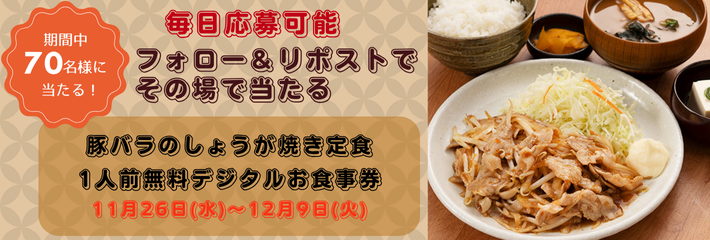 あわせて2025年11月26日(水)午前11時~2025年12月9日(火)の期間に「宮本むなし公式Xフォロー&リポストキャンペーン」を実施いたします。宮本むなしの公式Xアカウントをフォローし、キャンペーン投稿をリポストすることで期間中毎日応募でき、その場での抽選で定食屋宮本むなし店内で「豚バラのしょうが焼き定食」1人前をお召し上がりいただけるデジタルお食事券が70名様に当たるキャンペーンです。ぜひこの機会に宮本むなし公式Xのフォロー&リポストでのご参加をお待ちしております。