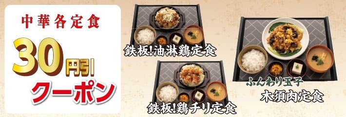 宮本むなしでは、デジタル技術を活用することでさらにお得に、便利にご利用いただけるようブランド体験のデジタル化(DX)取り組みを進めており、宮本むなし公式アプリでは12月9日(火)まで何度でも使用できる「中華定食各種30円引き」クーポンを配信しております。