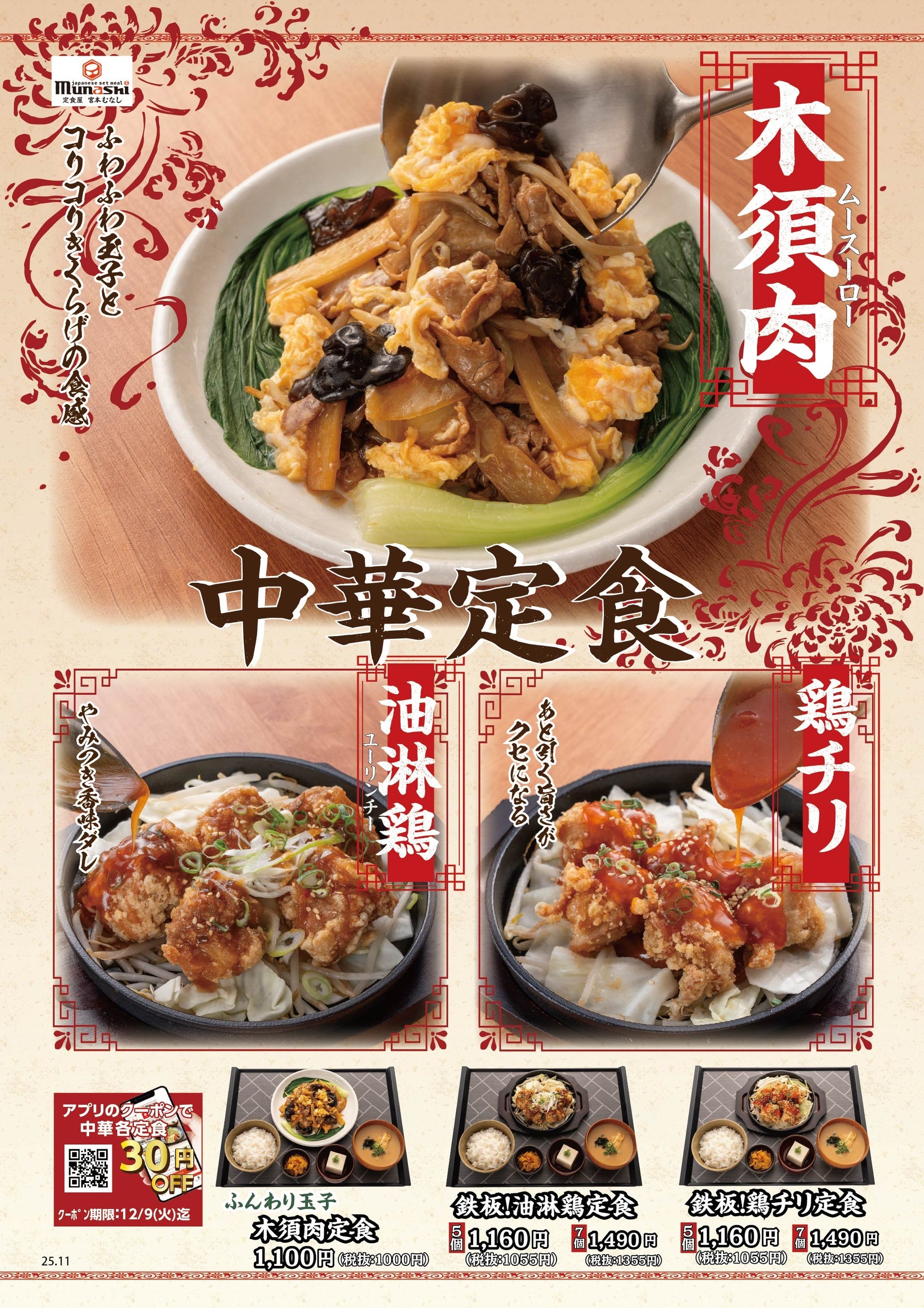 M&Sフードサービス株式会社(本社:大阪府大阪市、代表取締役社長:岡本 俊亮)が運営する定食チェーン「定食屋 宮本むなし」では、2025年11月26日(水)より、中華定食フェアとして「ふんわり玉子の木須肉鍋定食」「鉄板!油淋鶏定食」「鉄板!鶏チリ定食」の3種を期間限定で販売いたします。食欲そそる中華定食のおいしさをお楽しみいただけます。