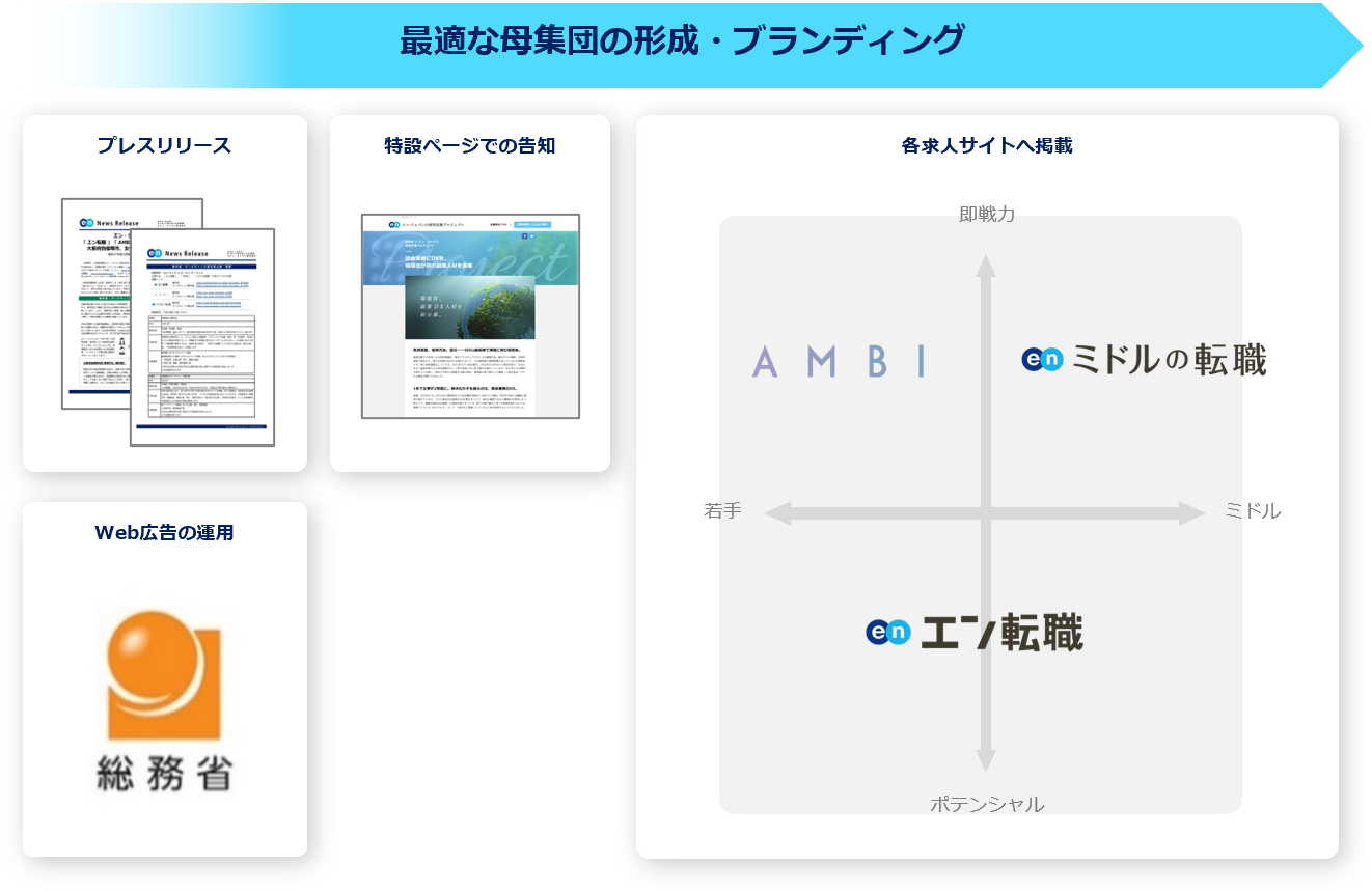 プレスリリースや特設ページ、Web広告での告知に加え、各求人サイトでの集客支援を行ないます。『エン転職』『AMBI』『ミドルの転職』とターゲットの異なる3つの求人サイトを活用することで、ターゲットへ網羅的に求人を届けます。
