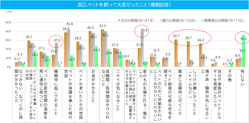 ペットごとに見ていくと、犬の飼育者では「散歩に定期的に行くこと(30.7%)」「しつけが難しかったこと(28.7%)」「鳴き声・騒音が気になること(26.3%)」、猫の飼育者では「家のものを壊される・傷むこと(39.8%)」「睡眠中に起こされること(27.0%)」がそれぞれの特徴として表れています。観賞魚の飼育者では「特にない」が36.2%と最も多くなっています。ペットごとに違いの見られる結果となりました。