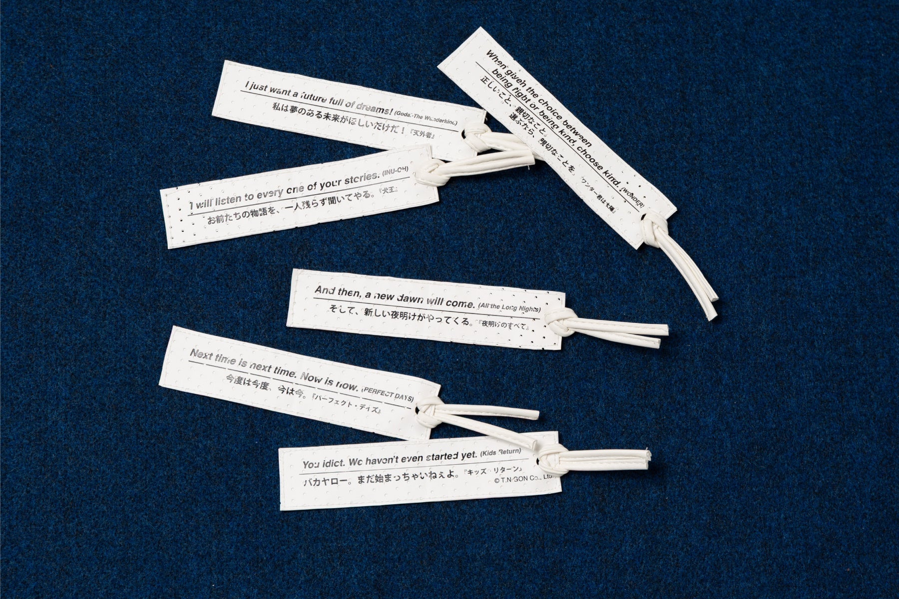 今回のアップサイクルアイテム「ブックマーク」では、映画ファンの皆さまから“好きな映画のセリフ”を募集し、その中から選ばれたセリフをデザインとして取り入れました。集まった数多くのセリフの中から6つを選出。さらにそのうち1つは、『ケイコ 目を澄ませて』『夜明けのすべて』などで高い評価を受け、昨年の第37回東京国際映画祭にて黒澤明賞を受賞した三宅 唱監督に選定していただきました。かつてスクリーンだったその素材に、映画の光と新たな物語を灯し、アップサイクルを通じて、映画を愛する人々の記憶と想いを未来へつなげていきます。