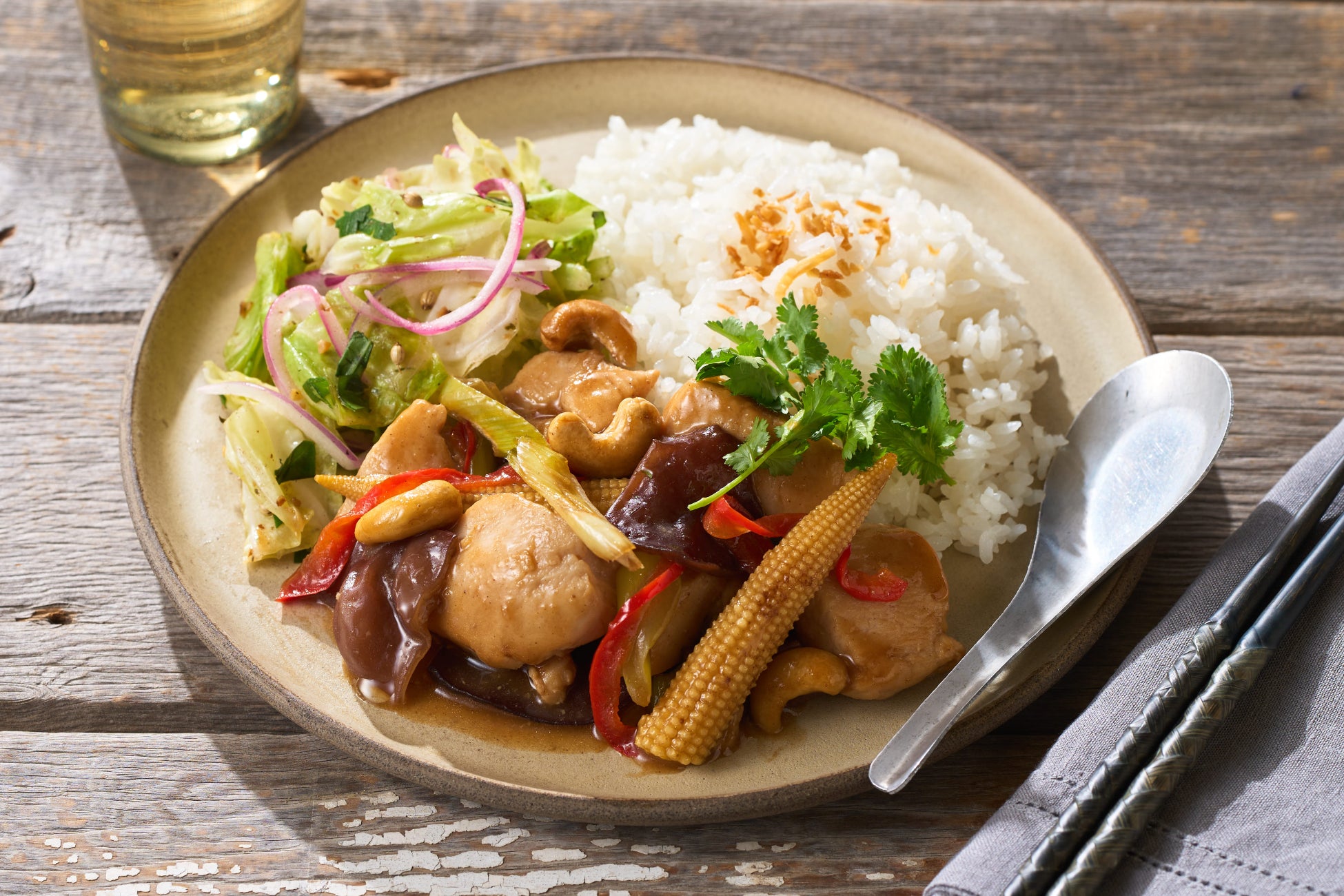 本ミールキットは、初夏の食欲を刺激するスパイスの香りと味わいを楽しむメニューです。使用しているスパイスは、5種以上の香辛料をブレンドした中国のほぼ全域で使われるスパイス「五香粉(ウーシャンフェン)」と、エジプト発祥のナッツとスパイスをブレンドした中東料理に欠かせないスパイス「デュカ」。主菜は、きくらげやヤングコーン、カシューナッツなど食感と彩り豊かな野菜とチキンを、香り高い五香粉とともにさっぱりとした酸味とまろやかな甘さのタレに絡めて食べる一品。合わせる副菜は、キャベツとハーブをデュカで和えた、爽やかで香ばしいマリネです。五香粉とデュカが食材のおいしさを引き立てる、スパイスの魅力を感じるメニューです。