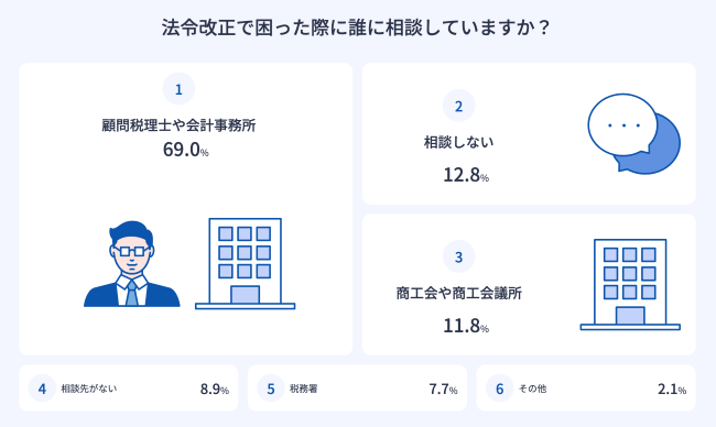 「法令改正で困った際に誰に相談していますか?」という質問については、「顧問税理士や会計事務所」と答えた方が69%と圧倒的に多い結果となりました。また、「相談しない」「相談先がない」と答えた方の合計は20%を超えました。