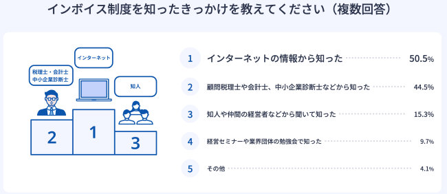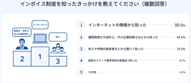 「インボイス制度を知ったきっかけ」の上位は、「インターネットの情報から知った」が50.5%、「顧問税理士や会計士、中小企業診断士などから知った」が44.5%、「知人や仲間の経営者などから聞いて知った」が15.3%という結果になりました。