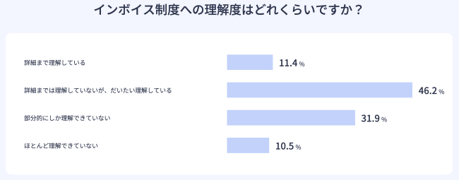 「インボイス制度を知っている」と答えた方のうち、「部分的にしか理解できていない」と答えた方が31.9%、「ほとんど理解できていない」と答えた方が10.5%という結果になりました。インボイス制度の詳細の浸透についても課題がありそうです。